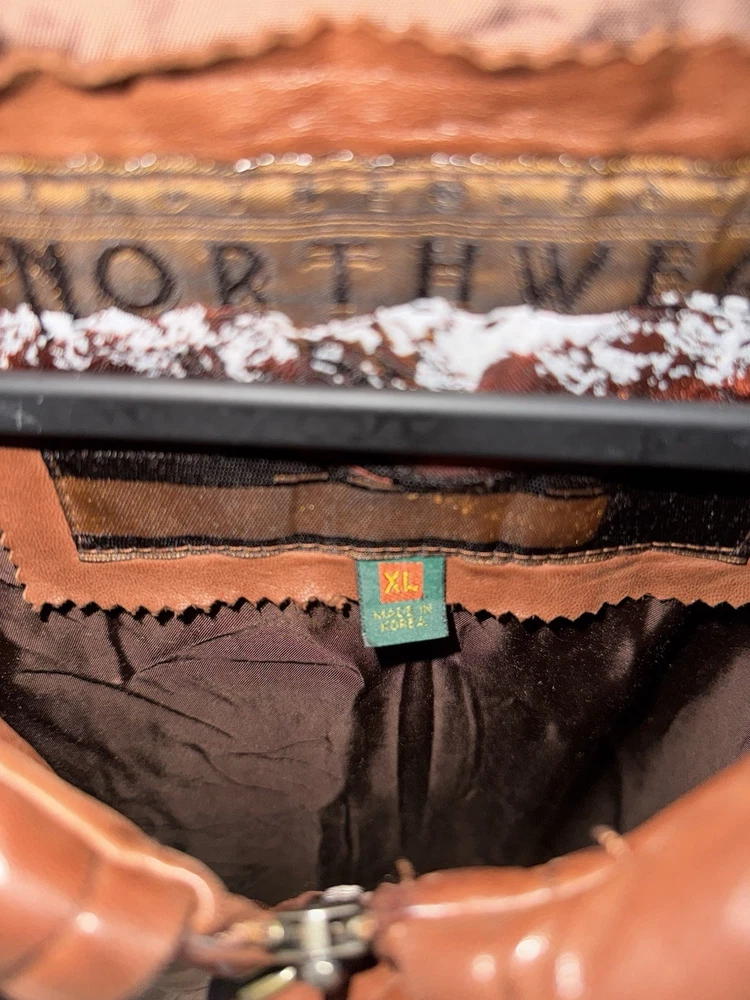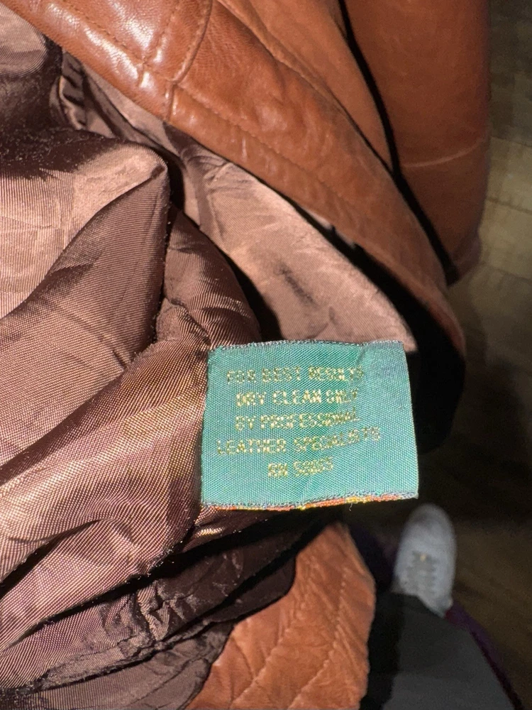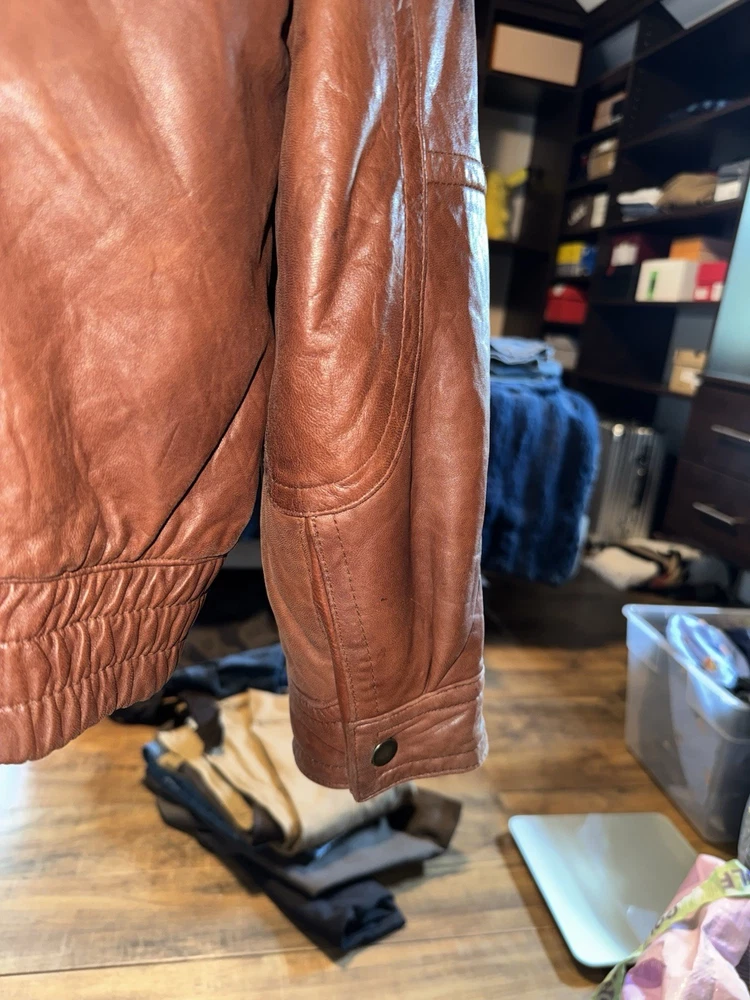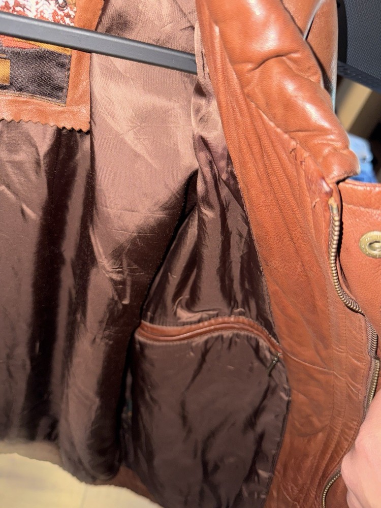 Rare find. Genuine leather. Fairly worn. Visible wear and tear. Visible stains. Elbow pads on sleeves! Please review photos before purchasing. Item is sold as is.