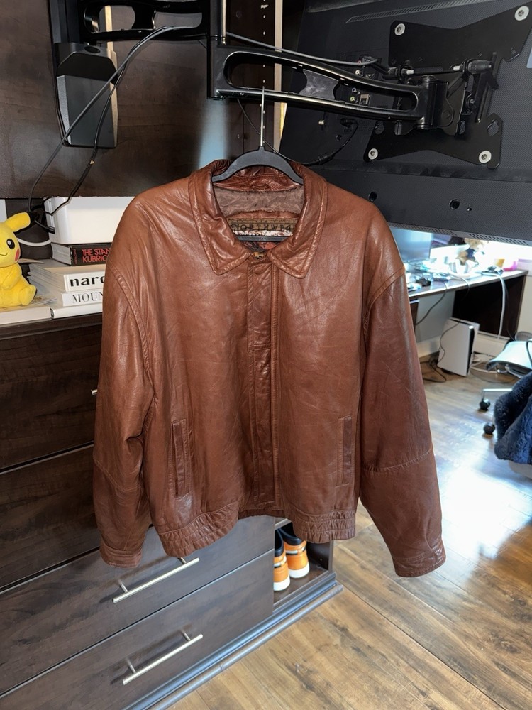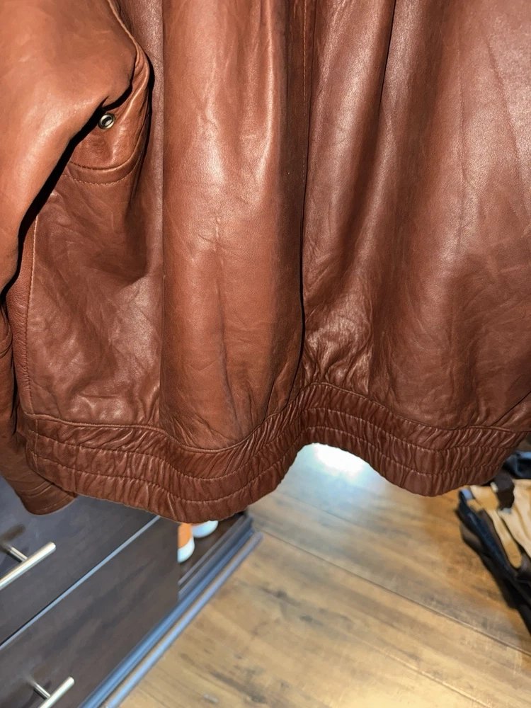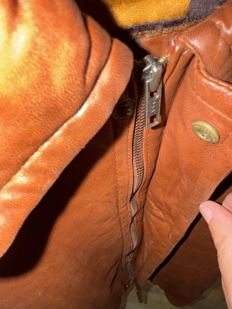 This vintage bomber jacket is a true gem—soft, genuine leather with a perfectly broken-in feel. The worn-in look adds character, and the elbow pads give it a cool retro vibe. Fits just right and feels incredibly sturdy. A rare find for lovers of authentic vintage style!