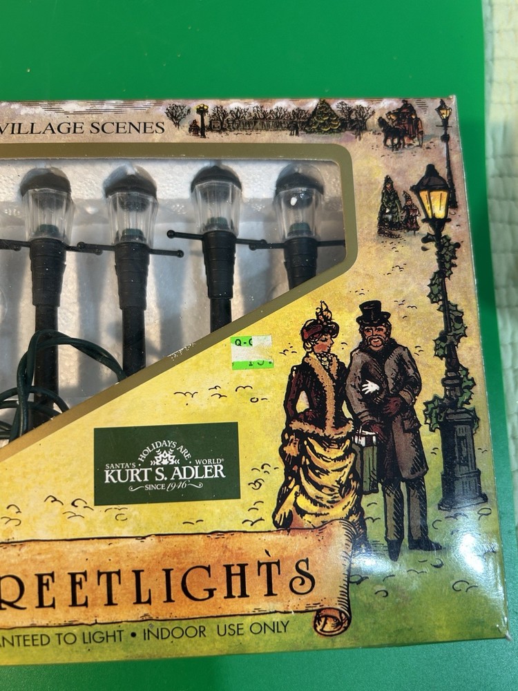The product is a set of 10 vintage Christmas street lamp lights by Kurt Adler, designed in an old Victorian style. These lights are perfect for adding a nostalgic touch to your holiday decor, with a classic and whimsical design that will bring a touch of vintage charm to your Christmas tree or outdoor display. The Victorian style adds a traditional and elegant feel to the holiday season, making these lights a unique and eye-catching addition to your collection of holiday figurines and decor. About 4.5 inches tall