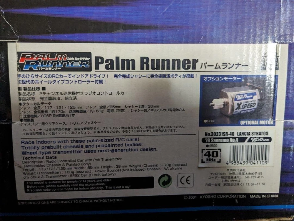 Kyosho Lancia Stratos Pirelli Palm Runner Kyosho Kyosho Lancia Stratos Palm Runner Radio-controlled car R/C, vintage item It appears to be unused, but was opened for inspection. It has never been taken out since I got it, but I don't know if the previous owner opened it. The radio-controlled car body and the radio control system have not been taken out. Only the exterior has been checked. Outer box dimensions Height: approx. 215mm Width: approx. 202mm Depth: approx. 100mm *Measurements are taken on a simple scale (for reference only) *Inside the box are the included radio control antenna and a small bag of accessories, the instruction manual, and a Kyosho pamphlet. It has not been taken out, so it has not been confirmed to work. Please consider this item if you understand this. As it has been stored for a long time, the radio-controlled car body has faded. The outer box also has wear and scratches. Please check the photos for the condition. Please refrain from purchasing if you are sensitive or looking for a perfect or mint condition item. ★Please see before dealings★ 【Payment】 Please complete payment for auction items within 5 days 【 Shipping 】 ※Usually goods will be shipped within 3 business days after payment is received. ※Time of delivery depend on the country or region. ※Package will be send by JAPAN POST OFFICE or YAMATO or Fedex with tracking number. It will be arrived about 1week ~ 3weeks on average after shipping information is provided. International Buyers - Please Note ・ Import duties, taxes and charges are not included in the item price or shipping charges. These charges are the buyer’s responsibility. ・ Please check with your country’s customs office to determine