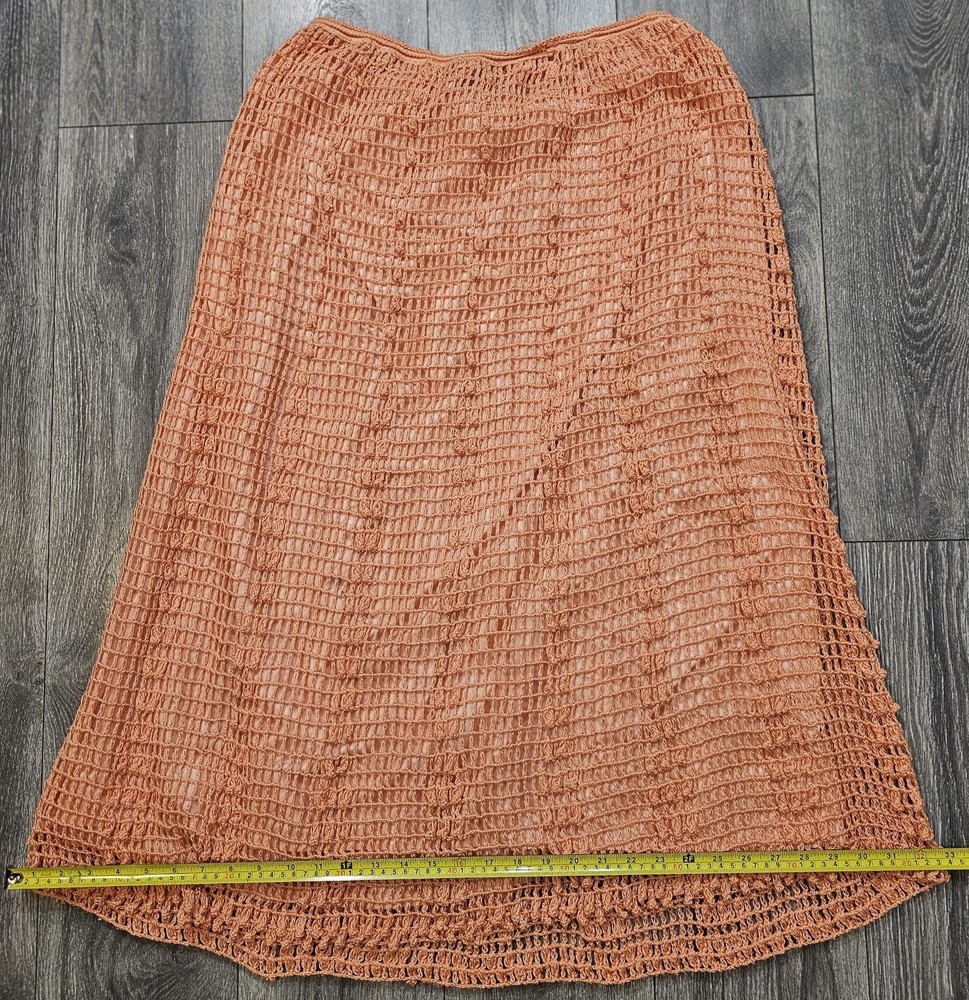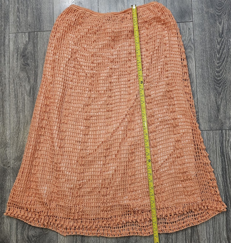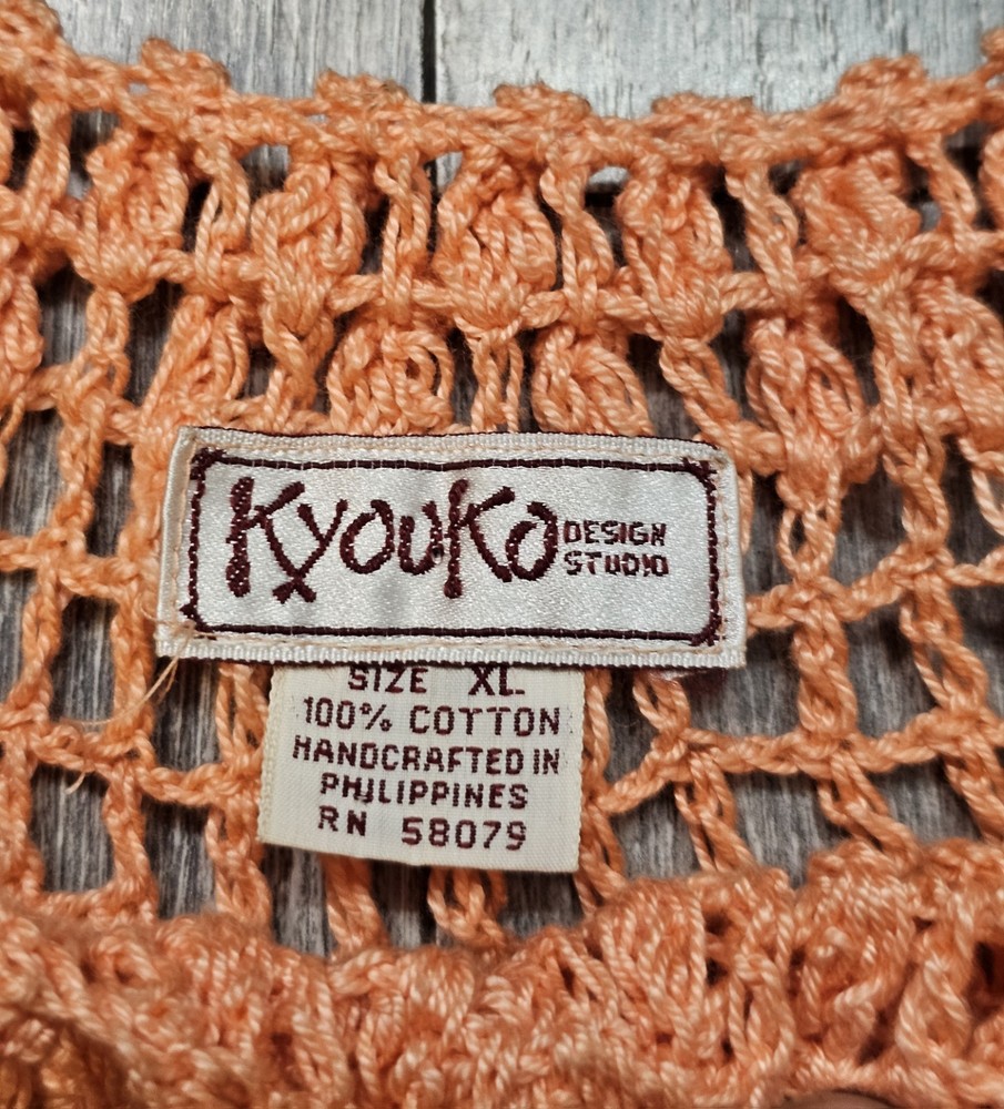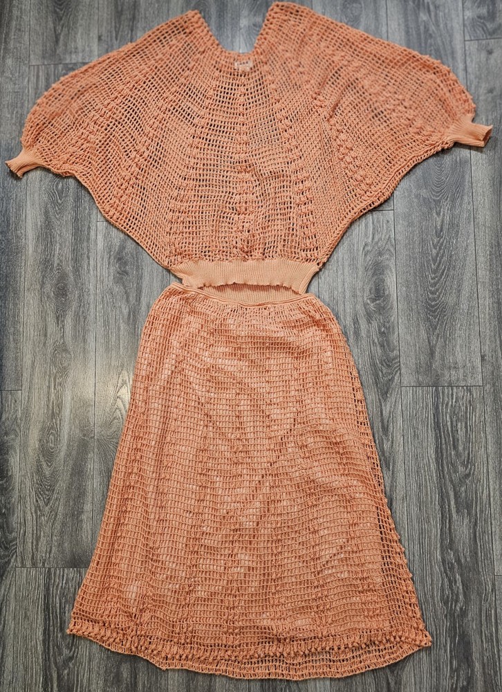 The Vintage Kyouko Design Studio Crochet Knit Set in Coral features a wide top with a lined skirt in size XL. This 2-piece set is perfect for activewear, with a pullover closure, crew neck, and bat sleeves. Made of 100% cotton, this handmade outfit is ideal for summer, fall, and spring seasons, showcasing a solid coral color with crochet accents. The relaxed fit and beach theme make this designer set a stylish choice for women looking for a unique crochet outfit.