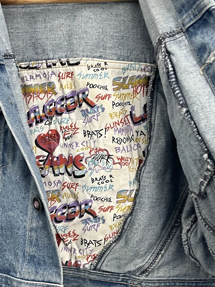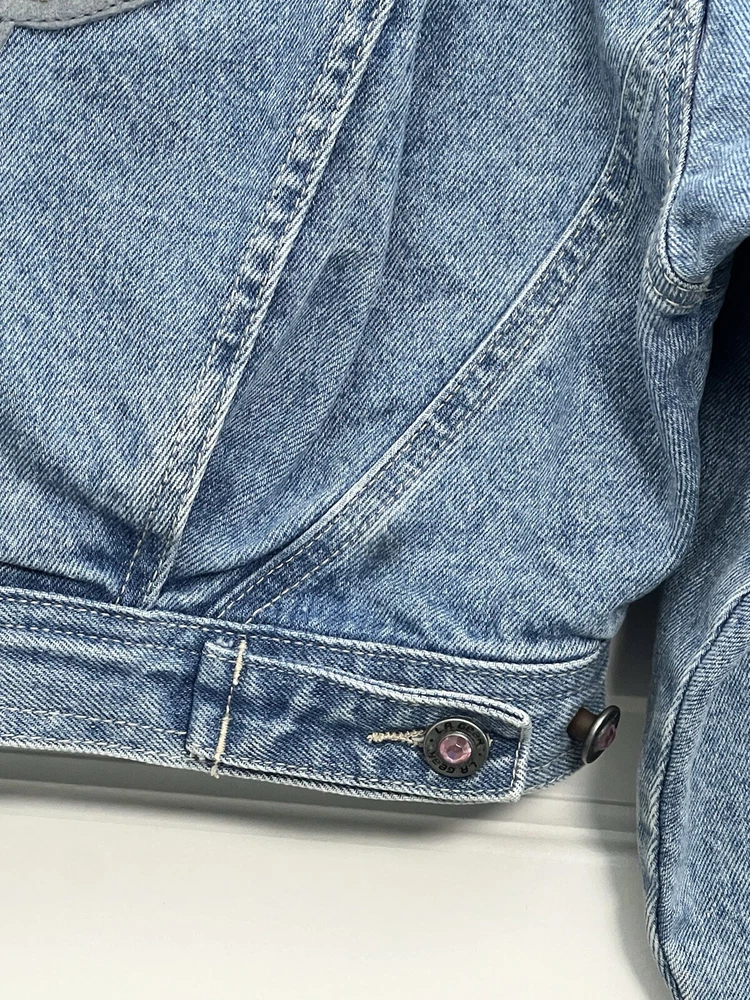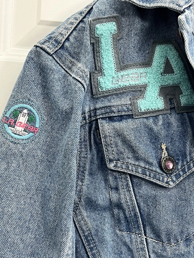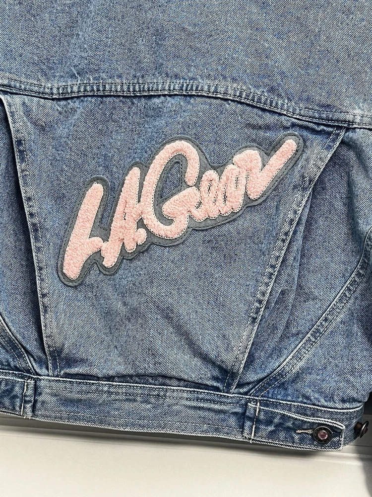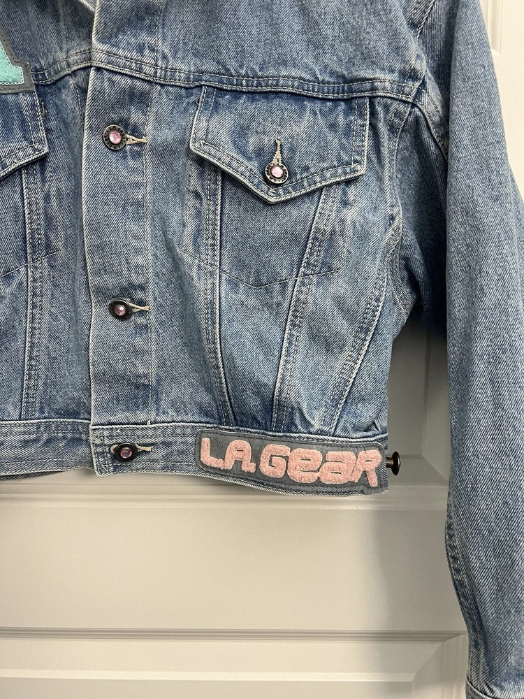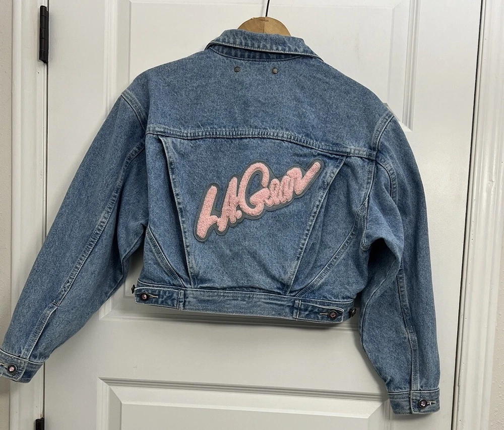 Double sided letterman Cropped, adjustable sides Pleated Pink Jeweled buttons Patches Inside graffiti In good preowned condition. The shoulder pad has an about an inch section that needs to be resown. Please see all photos. Follow for more.