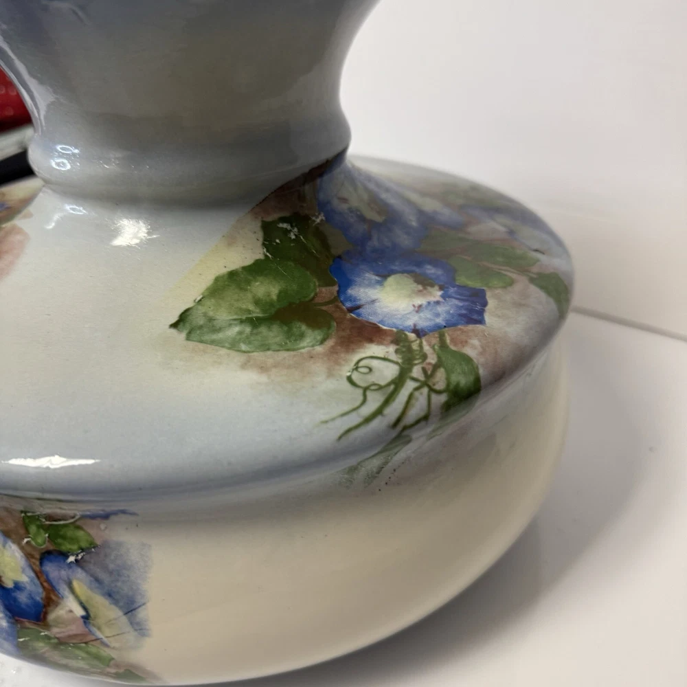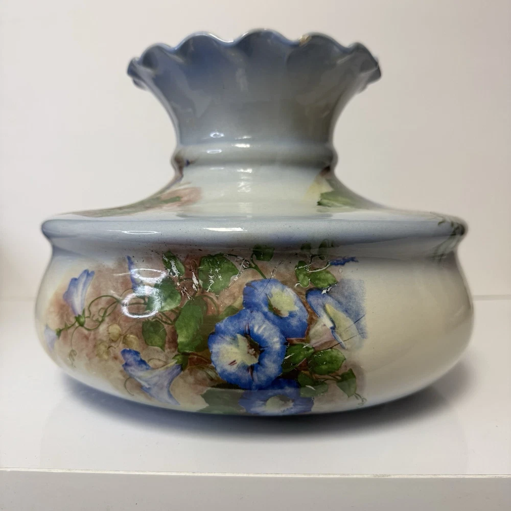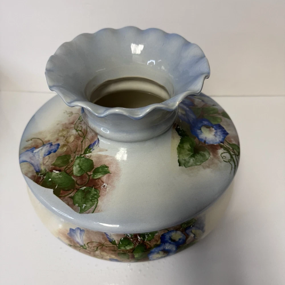 This large vintage Gone with the Wind hurricane lamp shade features a blue flower design with a Victorian style. It is the original hurricane lamp style from the 1970s. The shade has a white color and a flower design, making it a striking piece for any space.