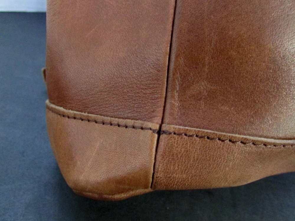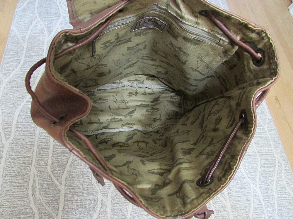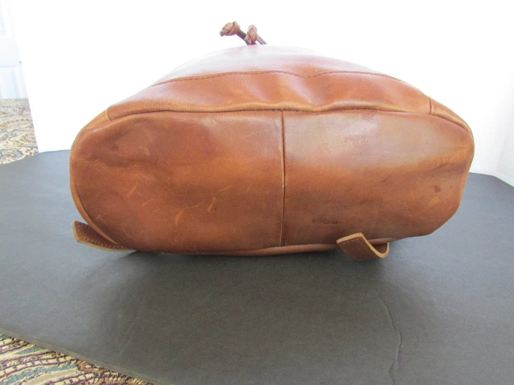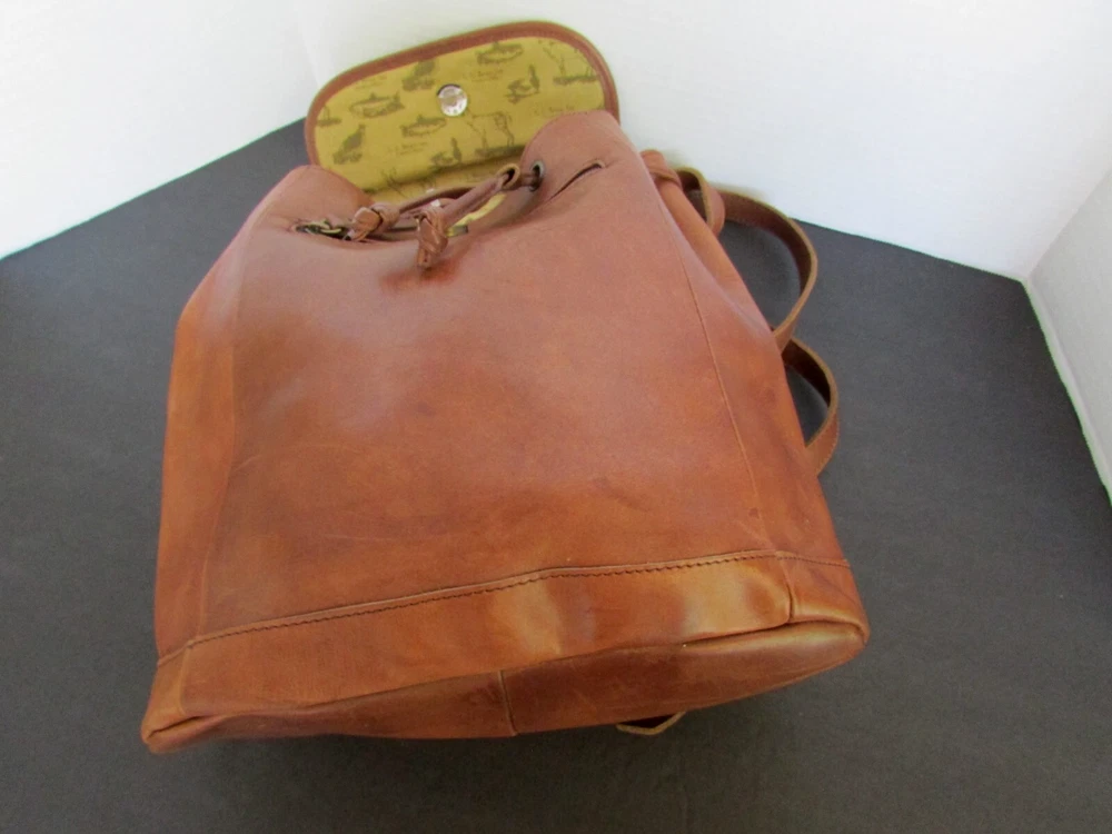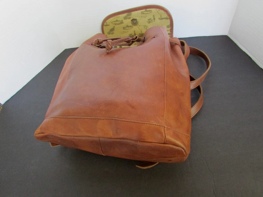 LL Bean Town and Field Rucksack Brown Leather Drawstring Backpack Purse lined Adjustable straps 12 inches tall 11 inches wide 5 inches deep manfactured distressed look mint condition-interior looks unused smoke and pet free home