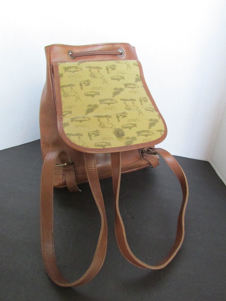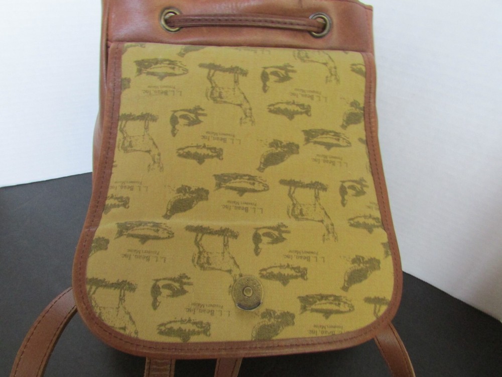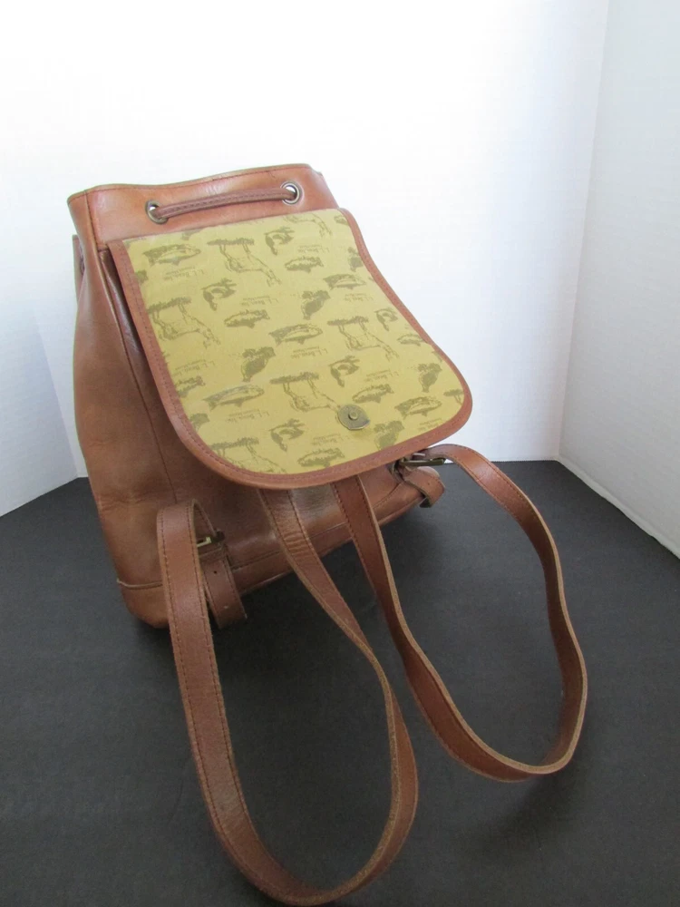 Handle/Strap Color: Brown Handle/Strap Material: Leather Style: Backpack Department: Unisex Adults Bag Height: 12 in Lining Material: Canvas Exterior Color: Brown Occasion: Casual, Travel, Workwear Personalize: No Exterior Material: Leather Vintage: Yes Finish: Distressed Closure: Drawstring, Magnetic Hardware Color: Gold Bag Depth: 5 in Pattern: Solid Bag Width: 11 in Handle Drop: adjustable straps Size: One Size Lining Color: Multicolor Brand: L.L. Bean Accents: Drawstring Theme: 90s, Classic, College, Hipster, Preppy, 2000's Handle Style: Backpack Country/Region of Manufacture: China Features: Adjustable Strap, Lined, Pockets Model: L.L. Bean Shape: Rectangle Hardware Material: Brass Product Line: L.L. Bean