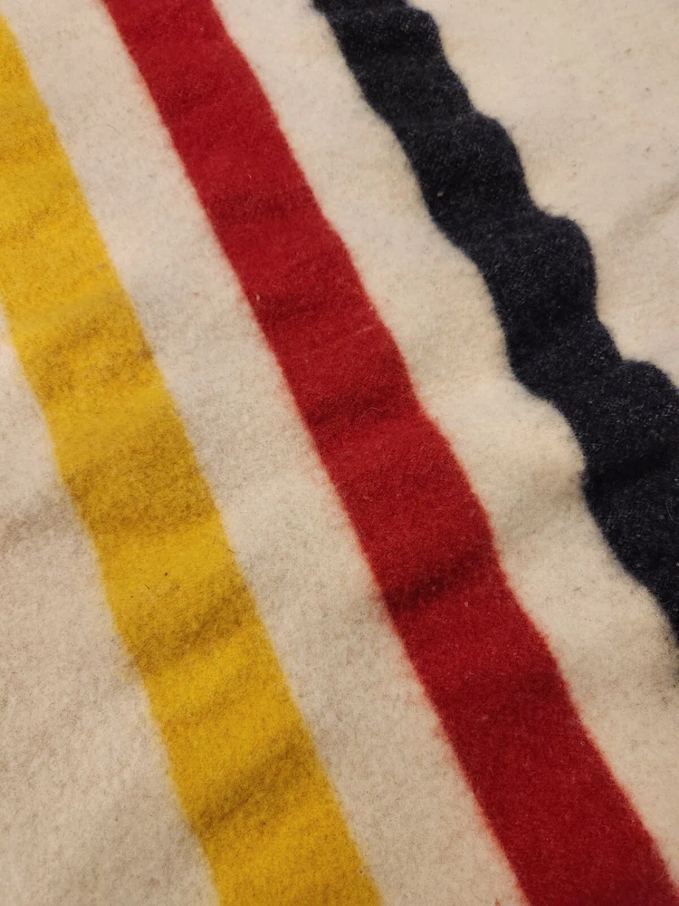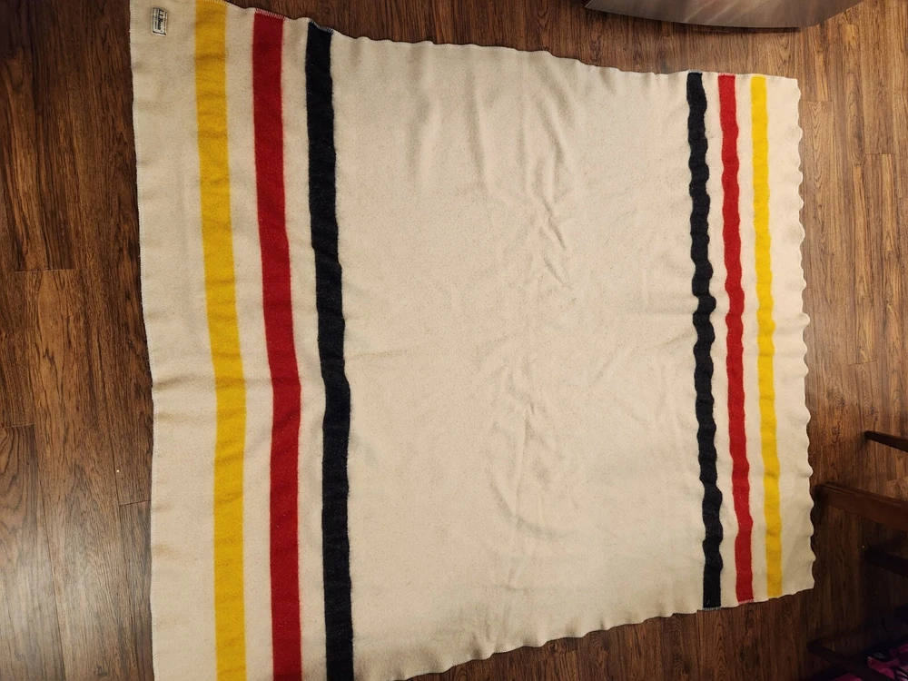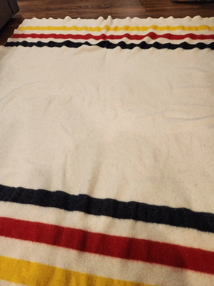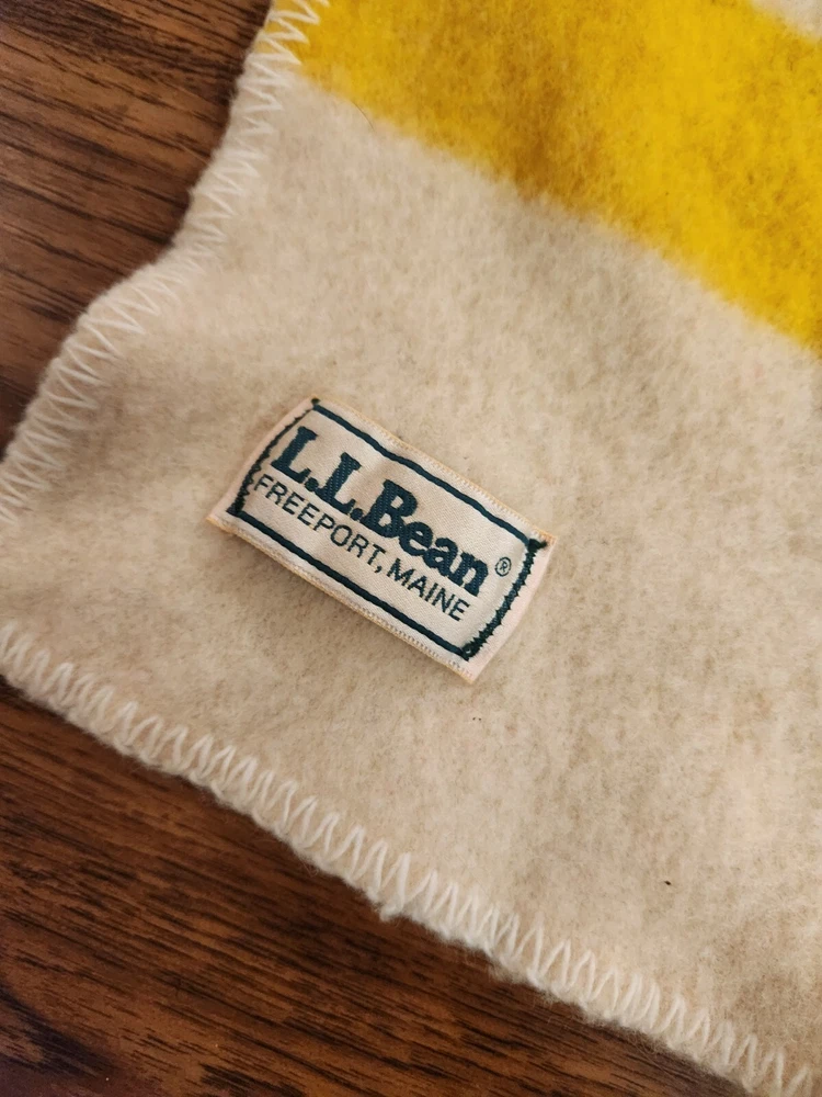 Vintage LL Bean Striped Wool Blanket. Measures approximately 82" long x 68" wide. White with three colored stripes. Good, vintage condition. Please see pictures for details and feel free to reach out with any questions.