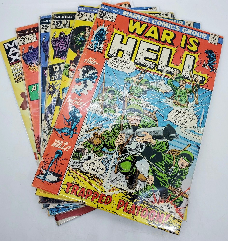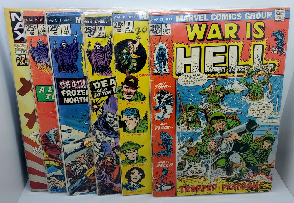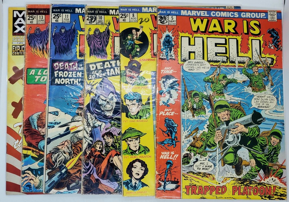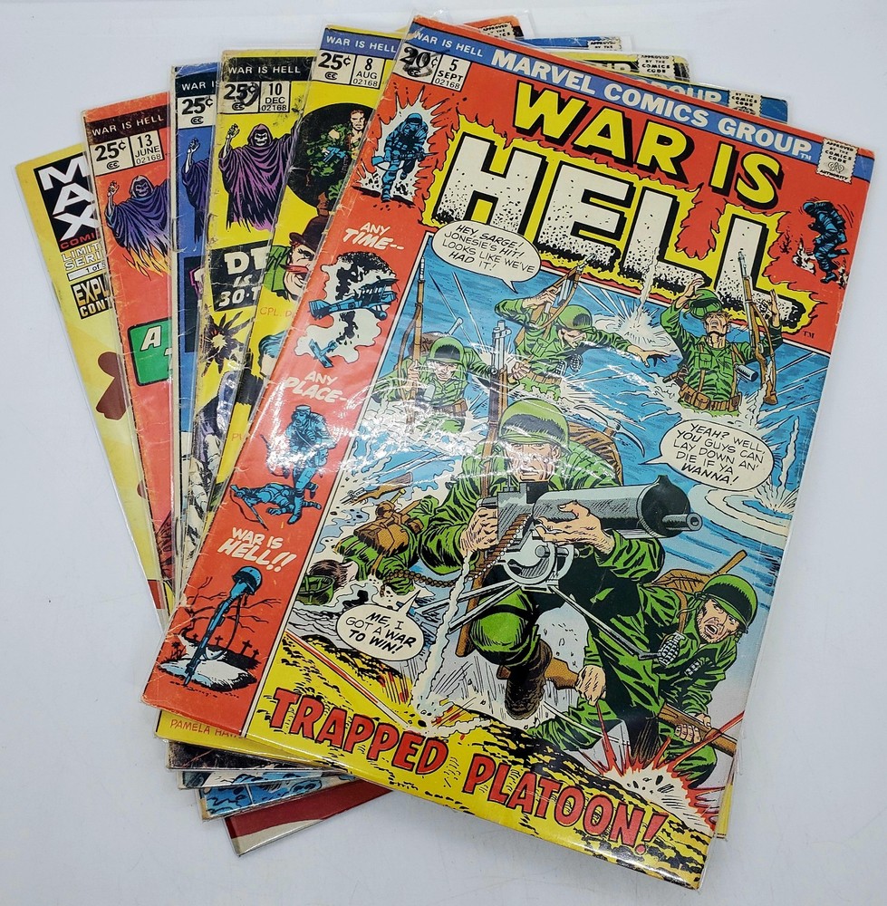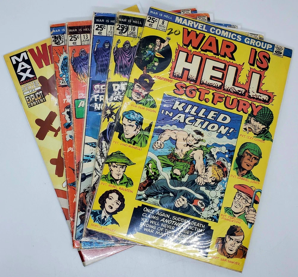 Vintage LOT of 6 War Is Hell #1-13 (Marvel Comics 1973) 1st Edition 1st Print!π₯ This vintage LOT of 6 War Is Hell comic books from Marvel Comics in 1973 features the first edition and first printing of issues #1-13. These single issues showcase the superhero team War is Hell, with characters like Sgt. Nick Fury and artwork by Adam Hughes. The comics are in English and part of the Marvel Universe, making them a desirable collectible for comic book enthusiasts and fans of the Bronze Age era. This lot is perfect for any collector looking to add a piece of comic book history to their collection.