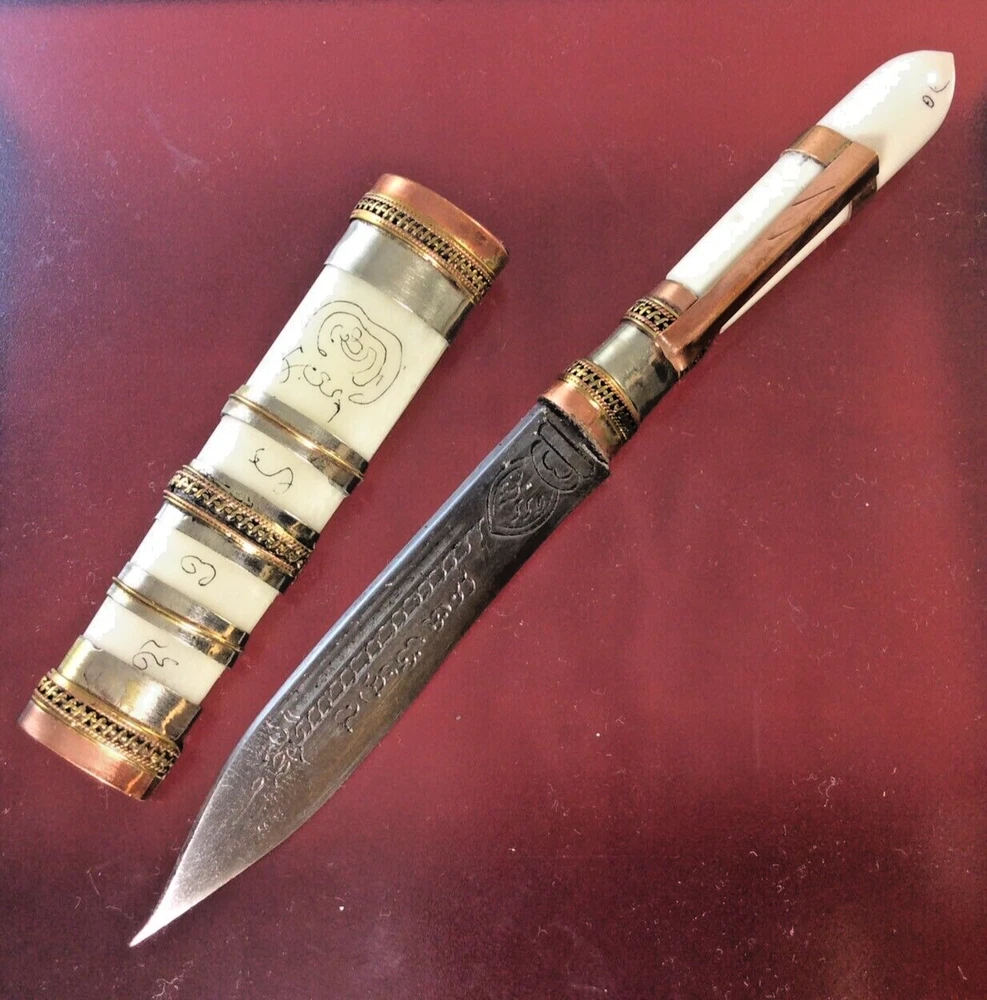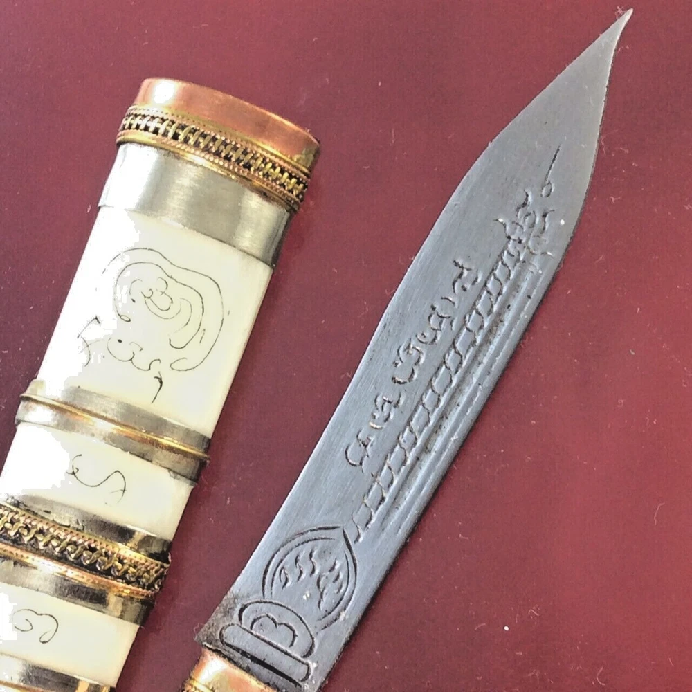 Vintage LP Derm Ceremonial Knife Unique Thai Buddhist Talisman Sacred Artifact This rare and authentic LP Derm ceremonial knife is a highly revered artifact, originating from the renowned Wat Nong Po Temple in Thailand. Measuring approximately 5 inches in length, this compact yet powerful knife (มีดอันเล็ก) was expertly handcrafted with exceptional attention to detail. The blade is forged from high-quality steel and features intricate engravings that symbolize spiritual protection, power, and blessings. The handle and sheath are beautifully adorned with traditional Thai patterns, premium materials, and sacred inscriptions, reflecting outstanding craftsmanship and deep spiritual significance. Attributed to the legendary monk LP Derm of Wat Nong Po Temple, this small ceremonial knife is not only a collectible piece of history but also a meaningful spiritual talisman. LP Derm is widely respected for his powerful amulets and sacred objects, believed to provide protection, prosperity, and good fortune. Its vintage condition, with a natural patina and fine detailing, adds to its authenticity and charm, making it an ideal addition to any collection or spiritual practice. Note: The photos shown are samples from our stock. The actual product may vary slightly FREE!! Shipping registered mail WORLDWIDE with tracking number. If you have questions, feel free to write me on e B a y message. THANK YOU FOR SHOPPING