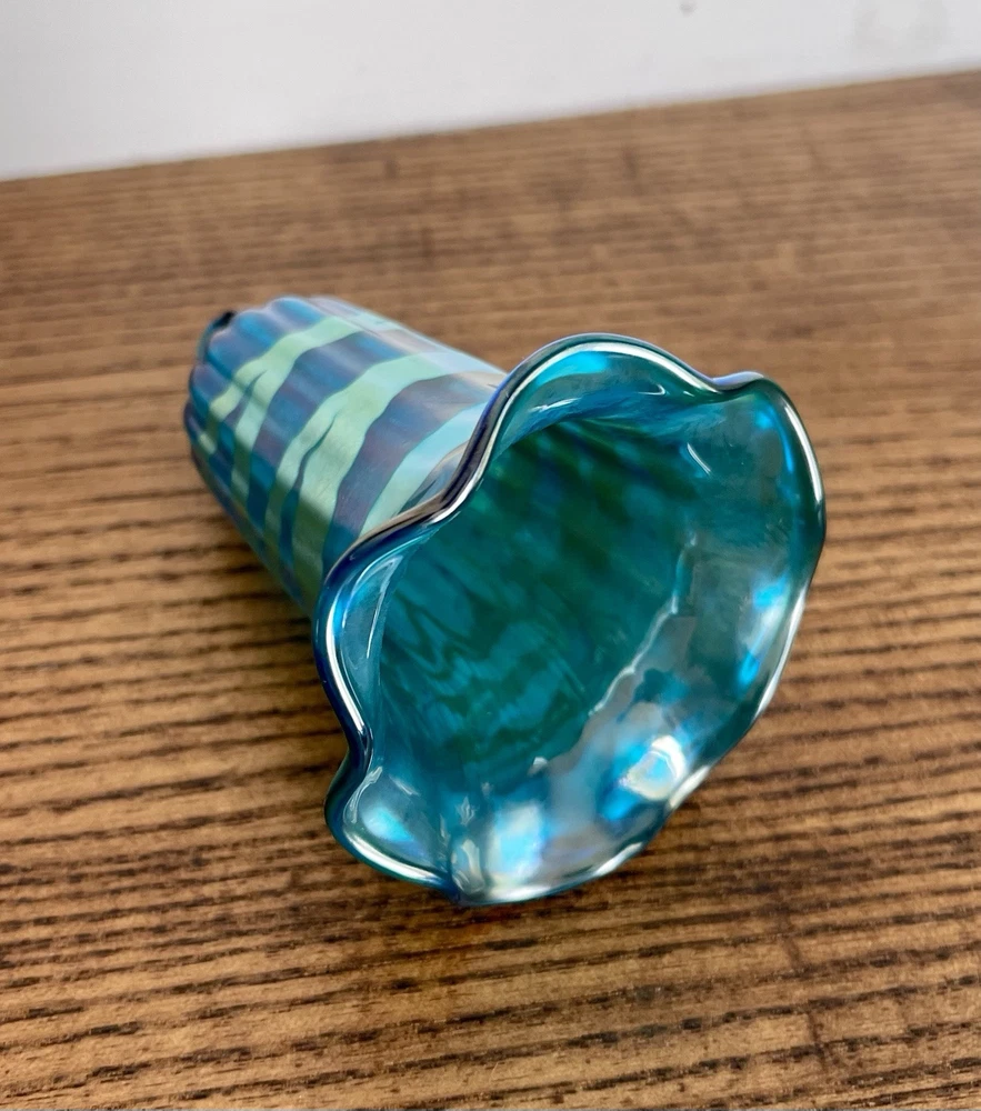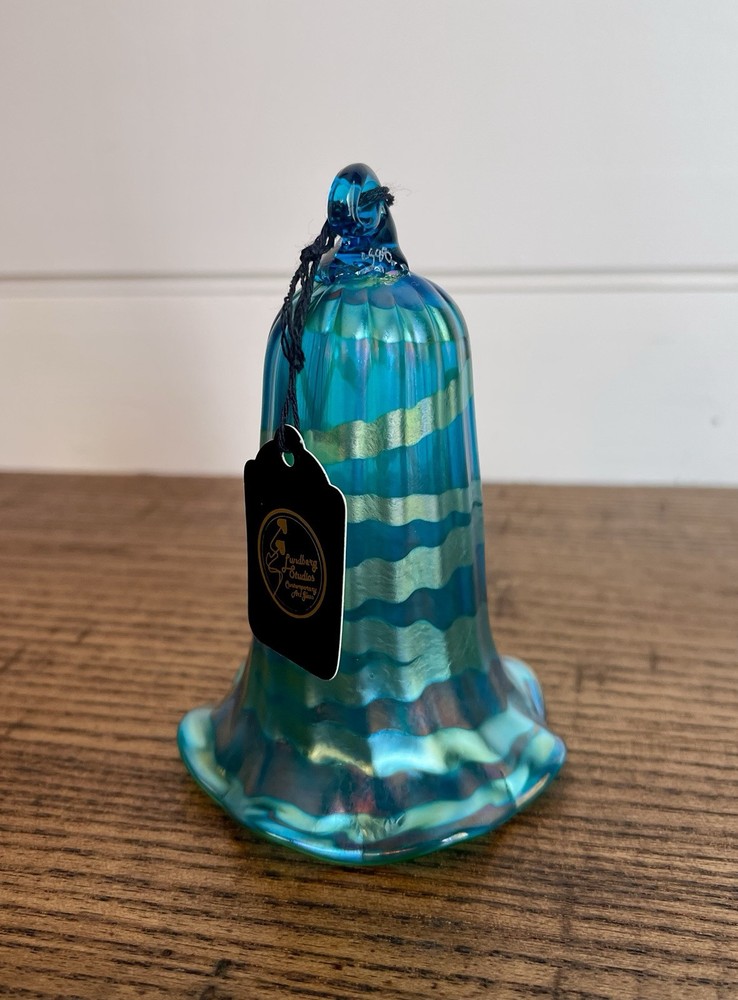 LUNDBERG STUDIOS-Vintage AURENE Art Glass Green & Gold Iridescent BELL Shaped Ornament-Signed-NWT Made in 1988...absolutely beautiful colors and execution. Original Tag-Never Used...MINT Like New Condition. Measurements: 2.5" round at bottom, 4" high Signed LS 88