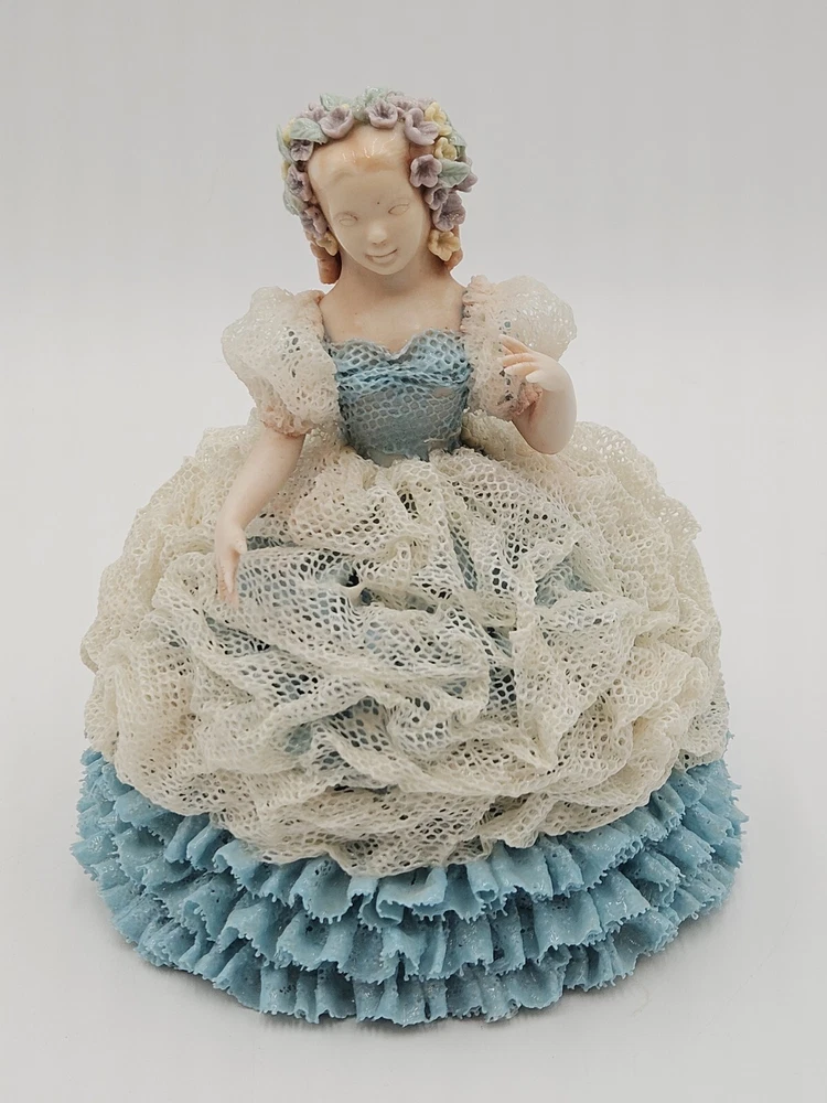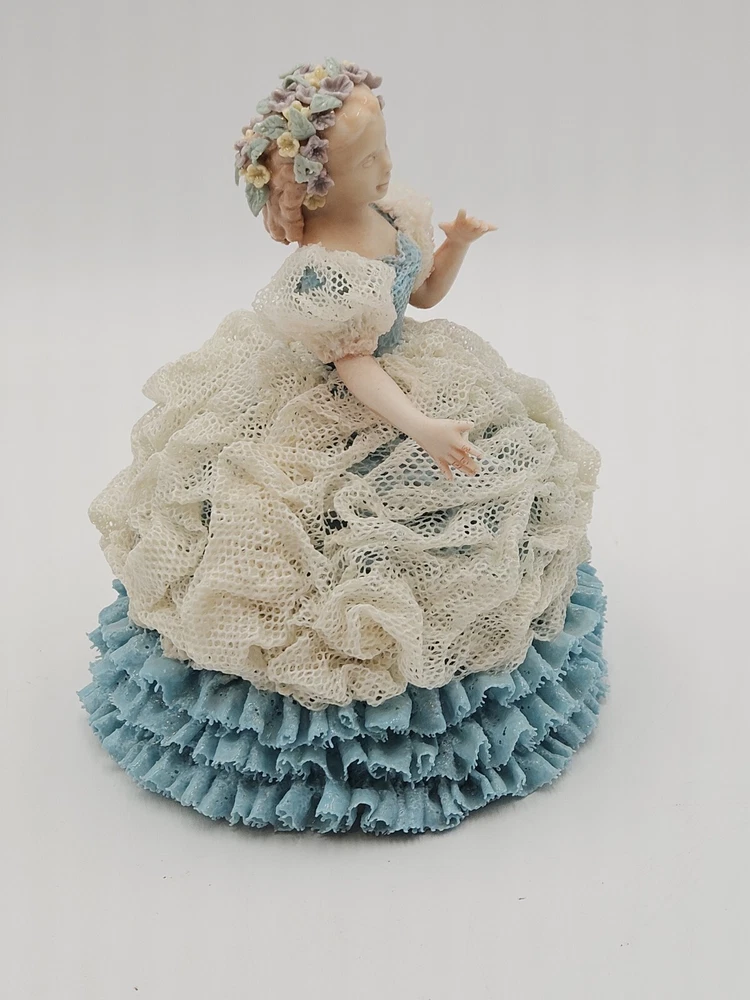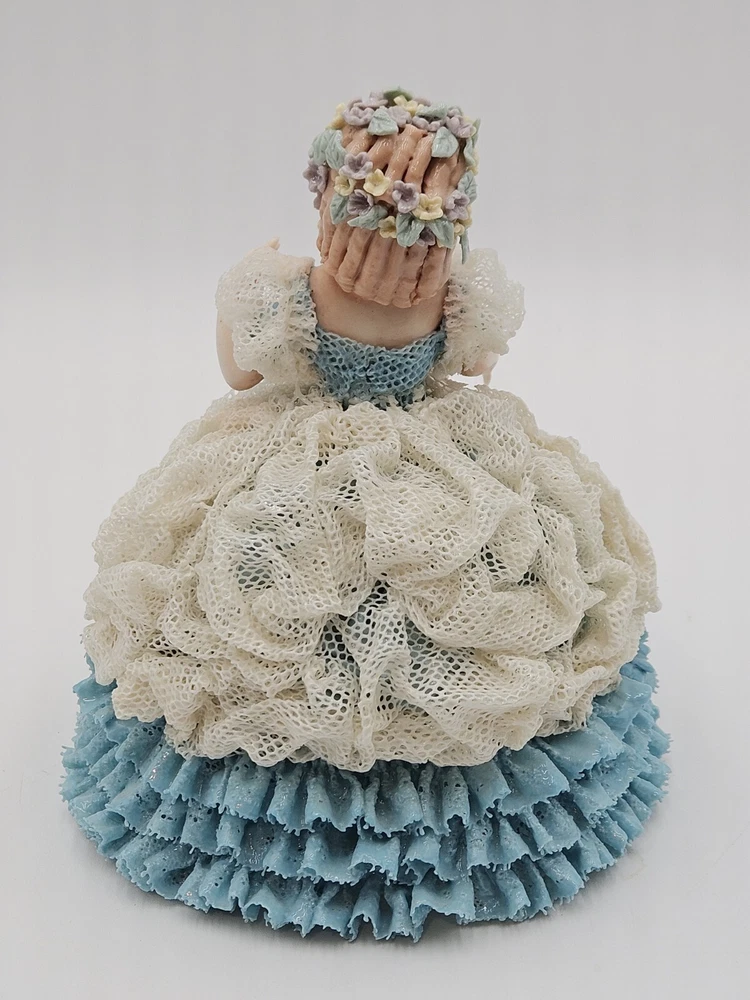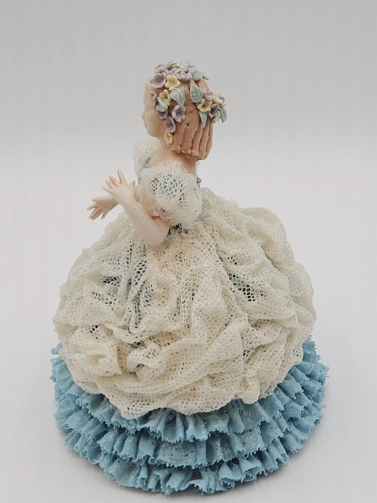 Vintage Lace Porcelain Woman Figurine Blue Dress Signed Maggie H 7"x7" Flowers