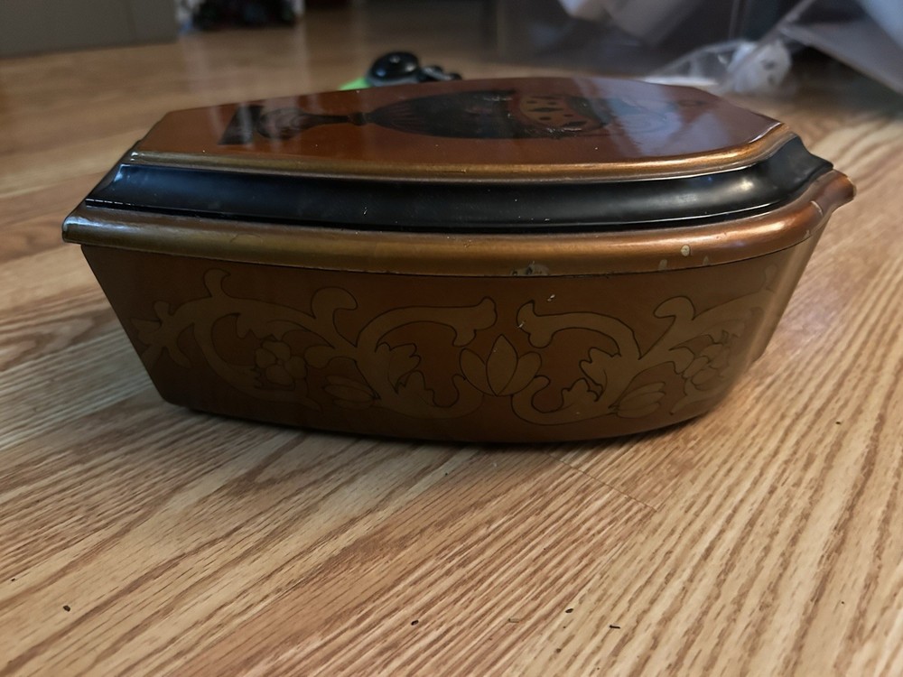 This vintage laquered box is a small, handmade trinket box made of wood. It features a boxing subject and a late 20th century design. The box is part of a collection of keepsake boxes, perfect for storing small items in any room. It has a lacquered finish and should be cleaned with a damp cloth. This unique piece is a perfect addition to any collection of decorative collectibles.