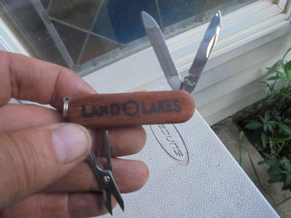 You are bidding on a Land O'Lakes pocket knife. It has a wood handle. There is a scissor, a small blade and a finger nail file. It comes in the original plastic box. This knife comes from an estate of a Land O'Lakes executive that retired in 2001. It measures 2 and 3/8 inches long. It is in excellent condition. I combine shipping on multiple purchases.