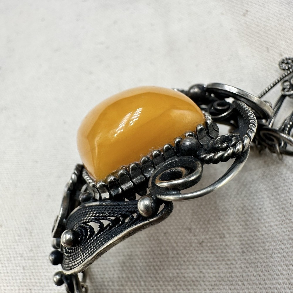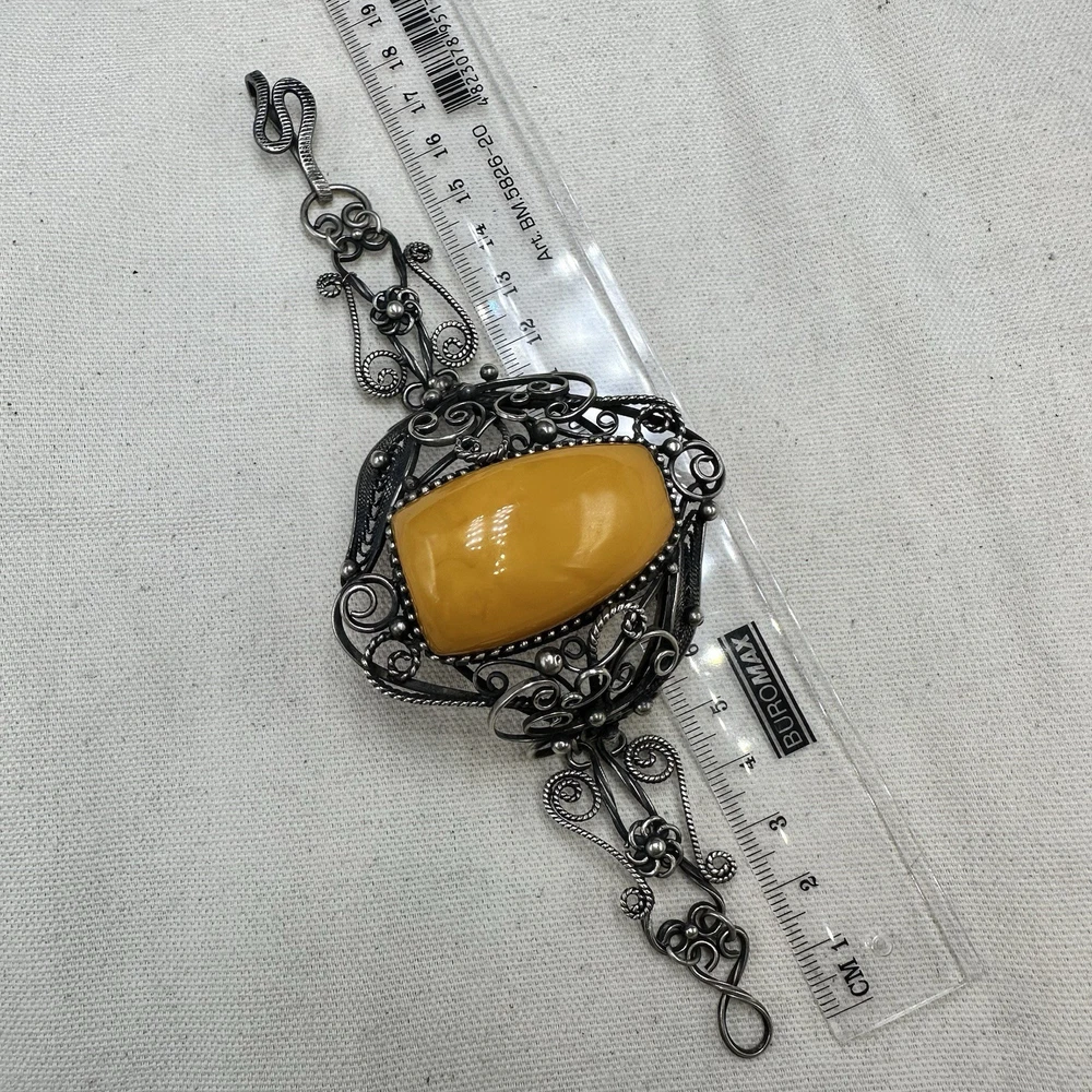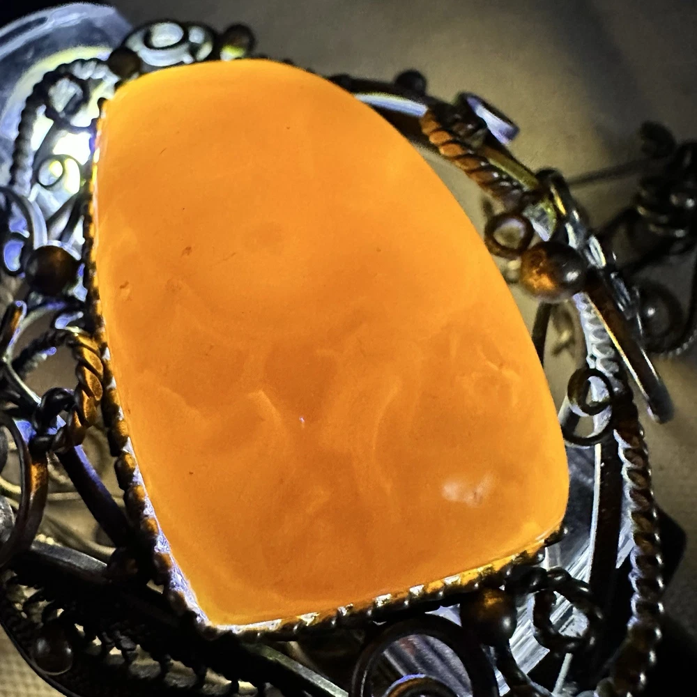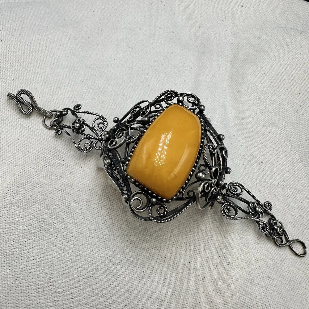 This vintage Baltic egg yolk amber bracelet in yellow color exudes a unique and timeless beauty, perfect for various occasions such as Mother's Day, Christmas, birthdays, and valentine's Day. The asymmetrical shape and huge cabochon main stone add a touch of elegance to the piece, which is a one-of-a-kind item with a Soviet-era charm. The bracelet is made of natural amber, making it suitable for women who appreciate vintage and bohemian style jewelry. There are my other items... https://www.ebay.com/usr/universeofjewelry