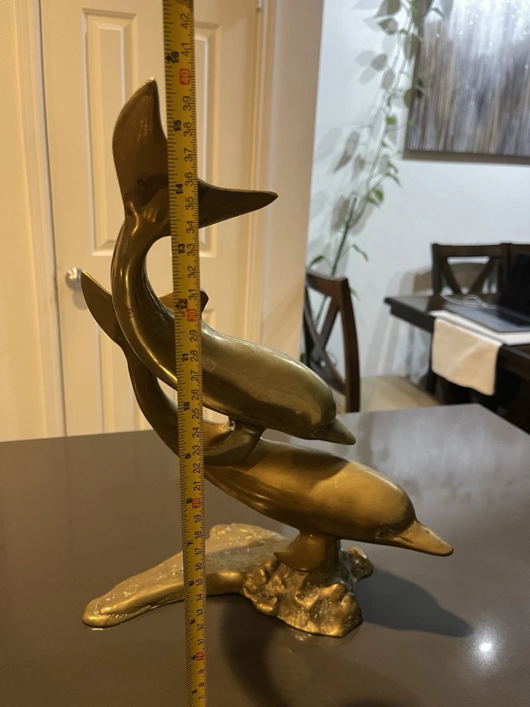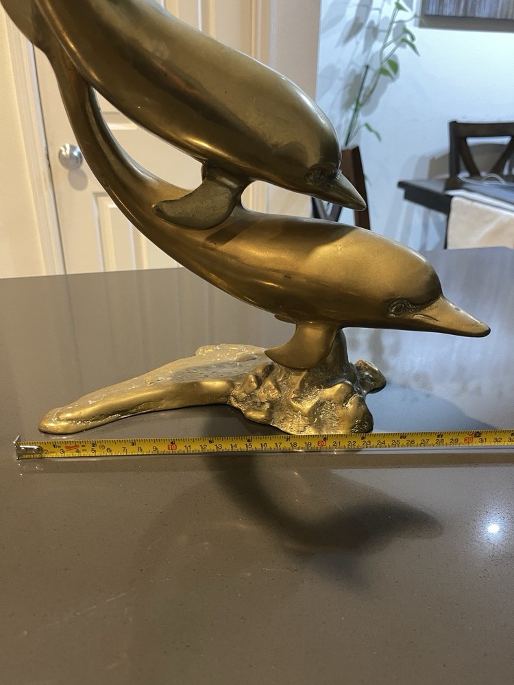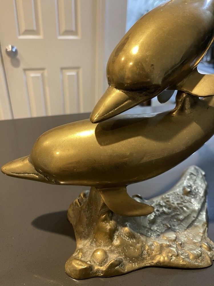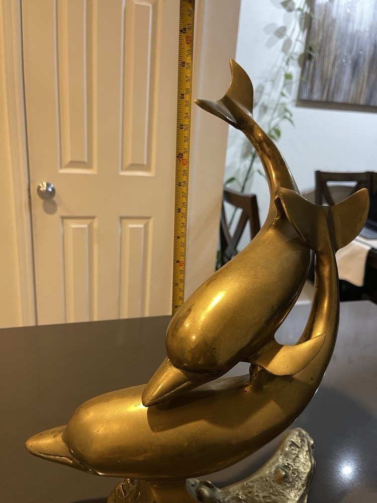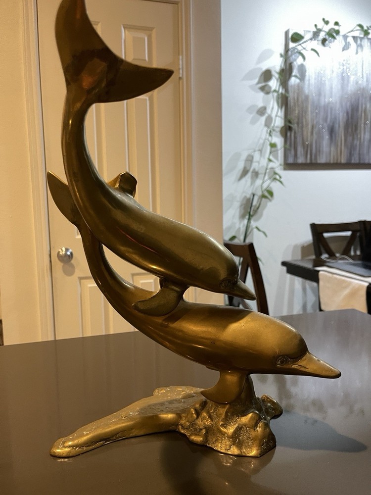 This vintage large dolphin sculpture from the 1970s is made of brass and is in great condition. Standing as a testament to the artistry of that era, this piece showcases the intricate craftsmanship and unique design of the time. The dolphin, a symbol of grace and beauty, is captured in a timeless and elegant form that is sure to be a standout in any collection or space.