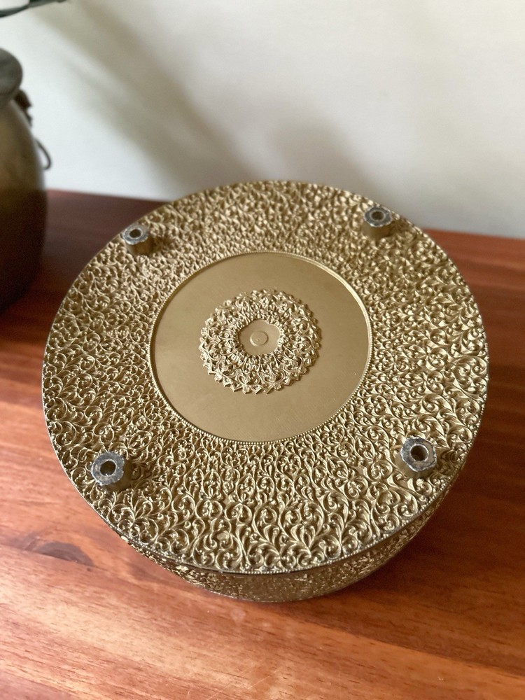 Vintage gold plastic storage box with lid. Good condition. Measures 5.5 inches tall and 8.5 inches in diameter. Combined shipping is available for all of my items listed.