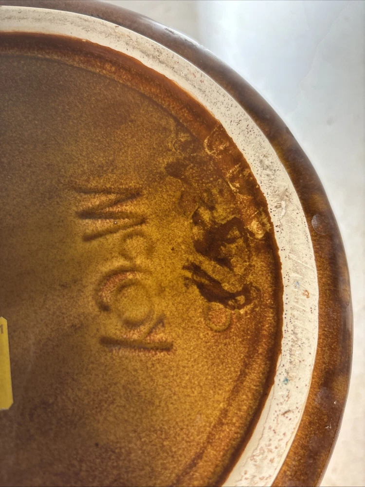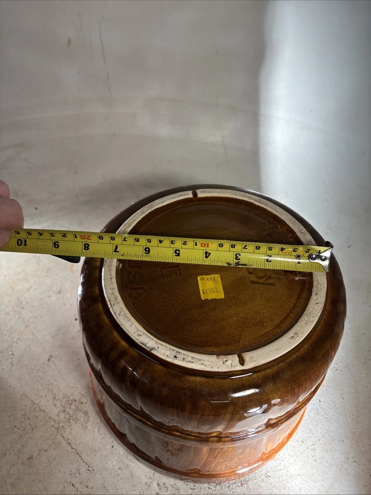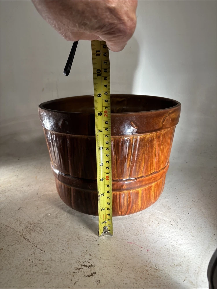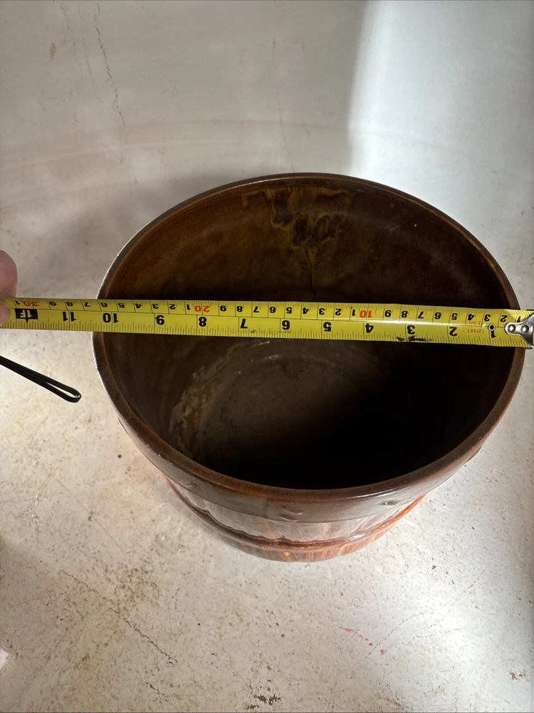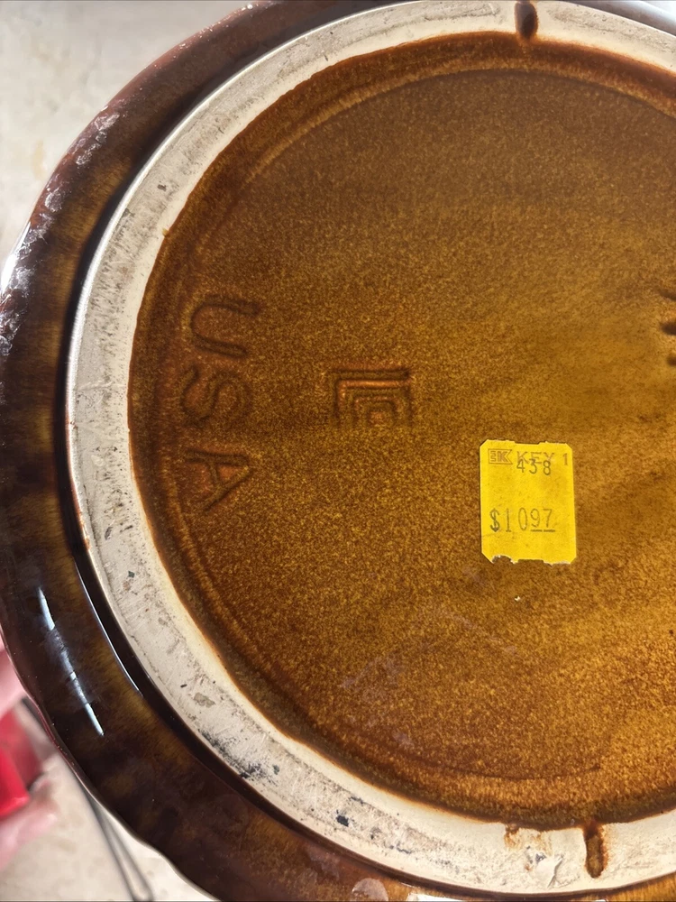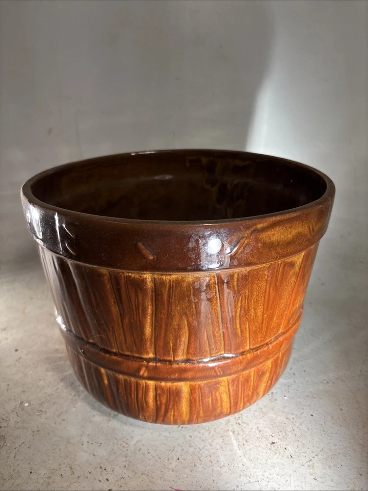 This vintage McCoy Art Pottery jardiniere/planter is a beautiful addition to any indoor space. The round shape and diamond quilted pattern with bow detailing add a touch of elegance to any room. The brown tan cream color and easy assembly make it a practical choice for displaying your favorite plants. Crafted in the mid-20th century in the United States, this original piece is made of clay and measures 8 inches in height with a width of 8 inches on the inside and 9 inches on the outside. The backstamp is impressed and the production technique is pottery. This jardiniere/planter is perfect for collectors of art pottery and those who appreciate the beauty of vintage decor.