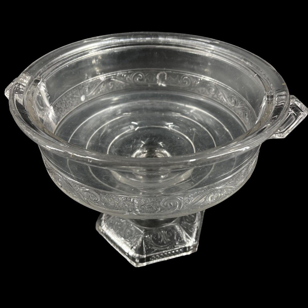 Large Vintage Pedestal Compote Two Handles Embossed Scrollwork Centerpiece 8" Embossed band around lower portion of bowl. Appears to be Caesar head and scrollwork. Similar scrollwork around the base and the stem. Internal bubbles in glass. 7 3/4" diameter at top rim and 6 1/2" tall.