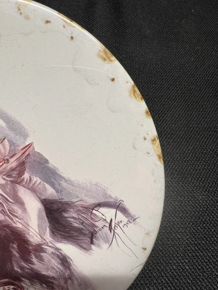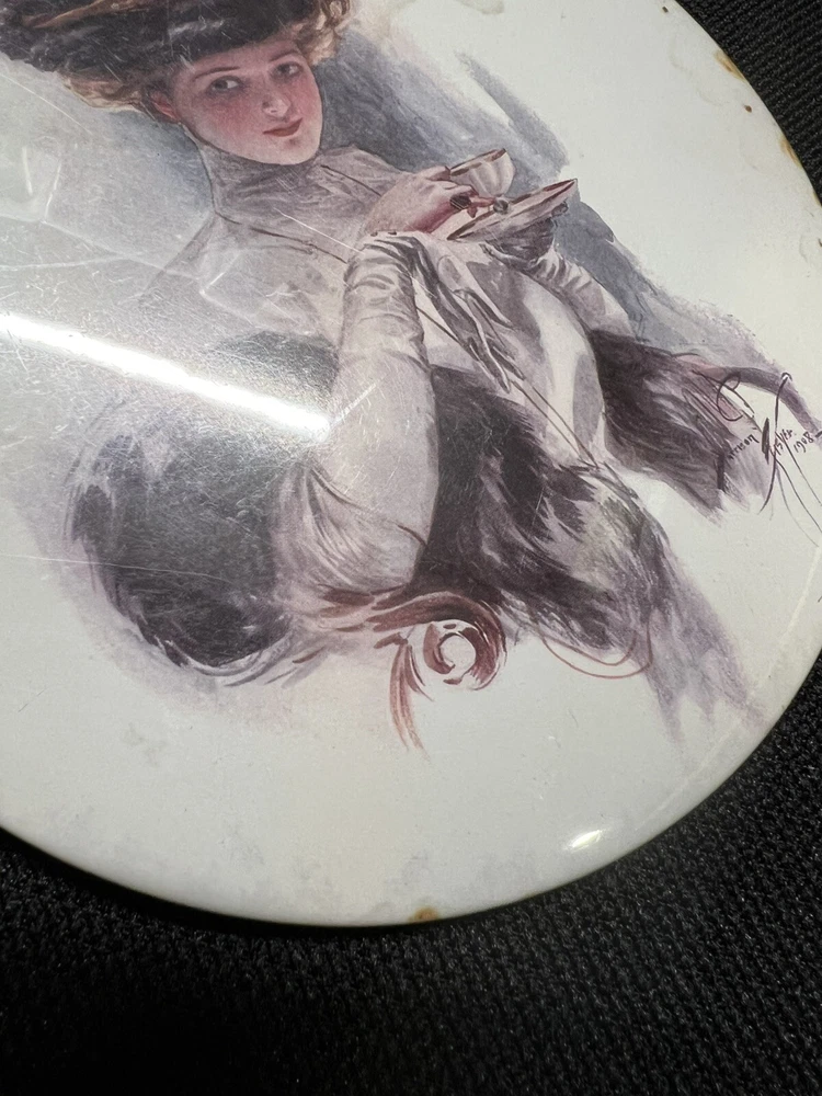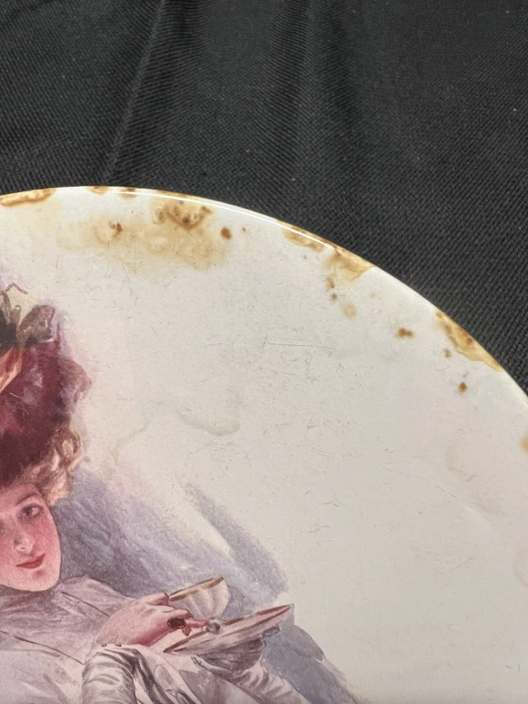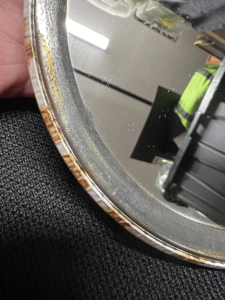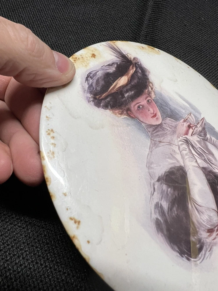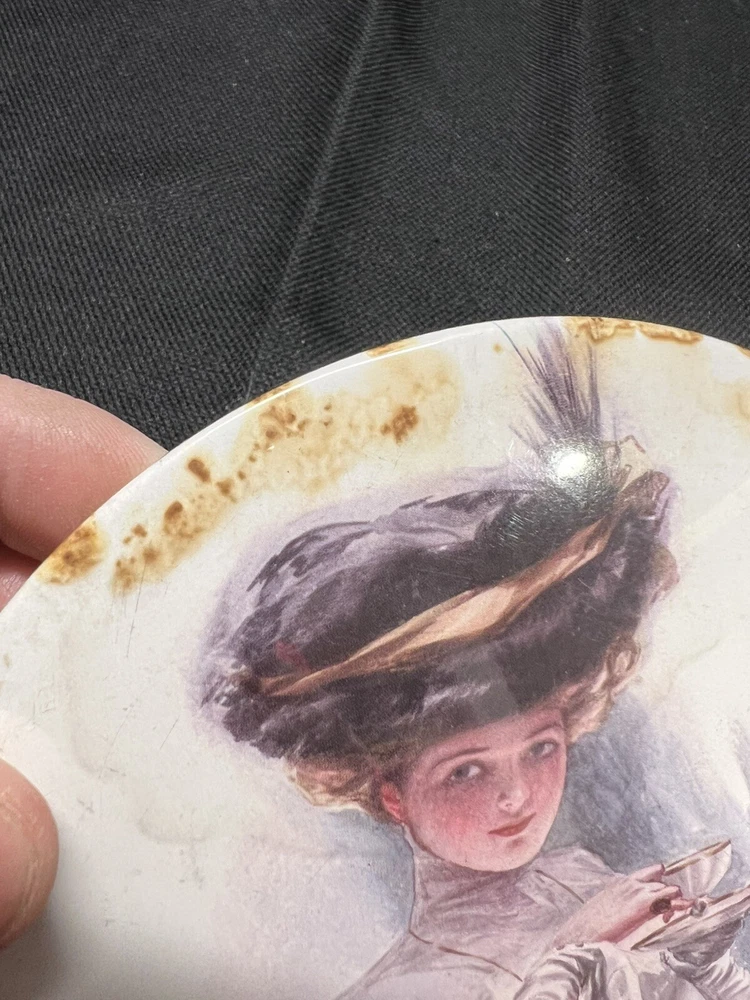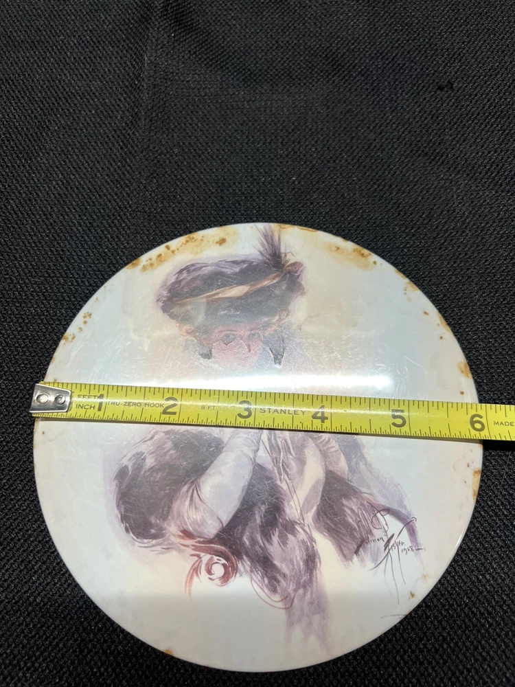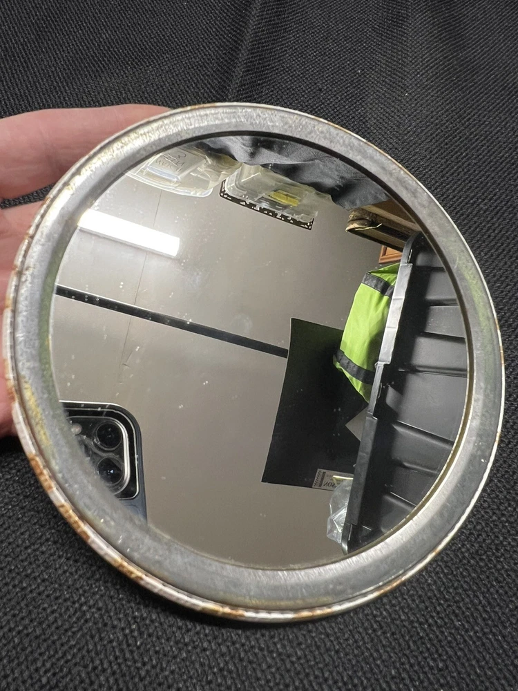Front side of mirror is in great condition. Back side has yellow staining due to moisture getting underneath it. Hand mirror measures 6” in diameter. Selling as is, any questions feel free to send a message.