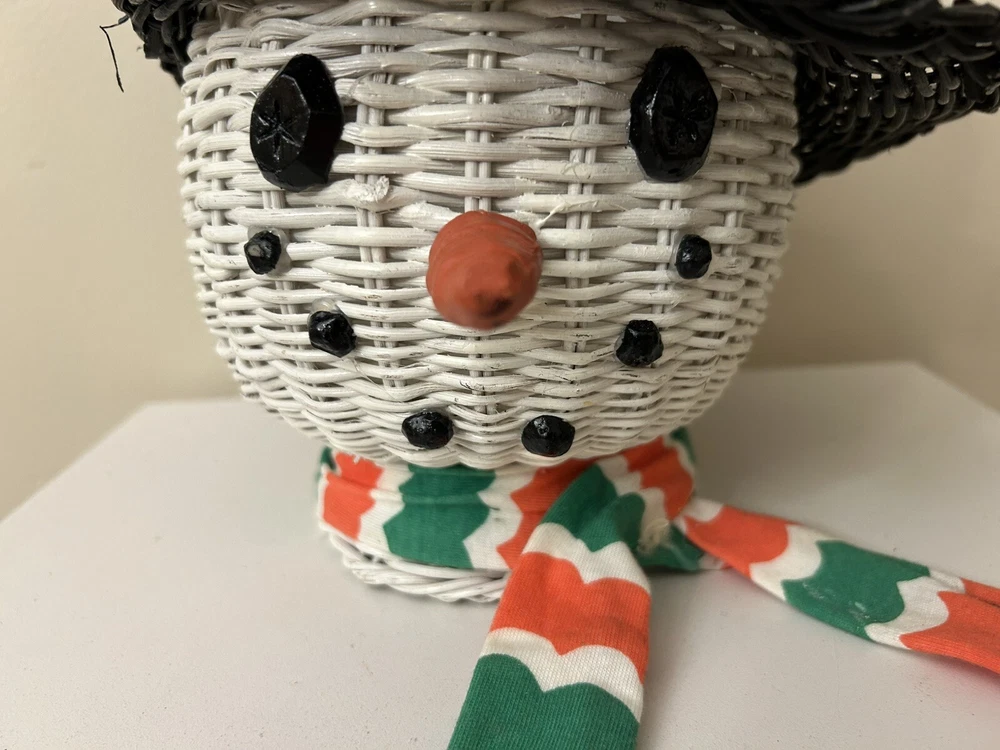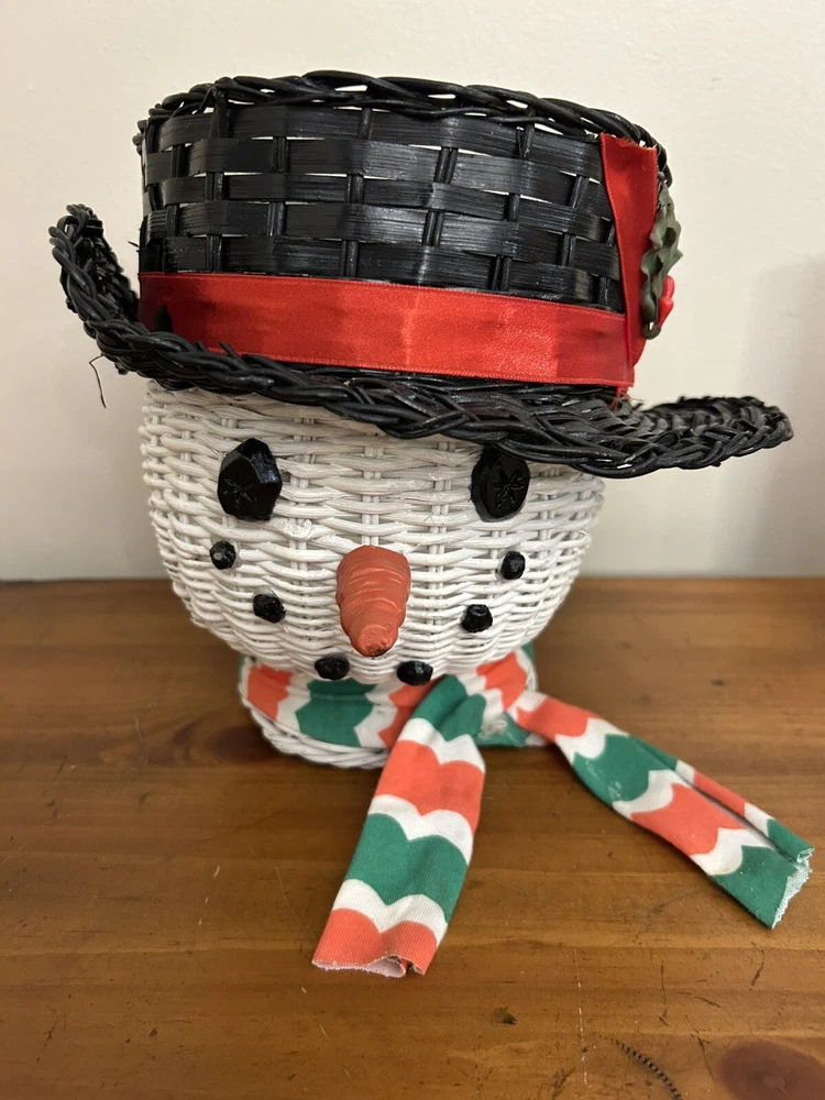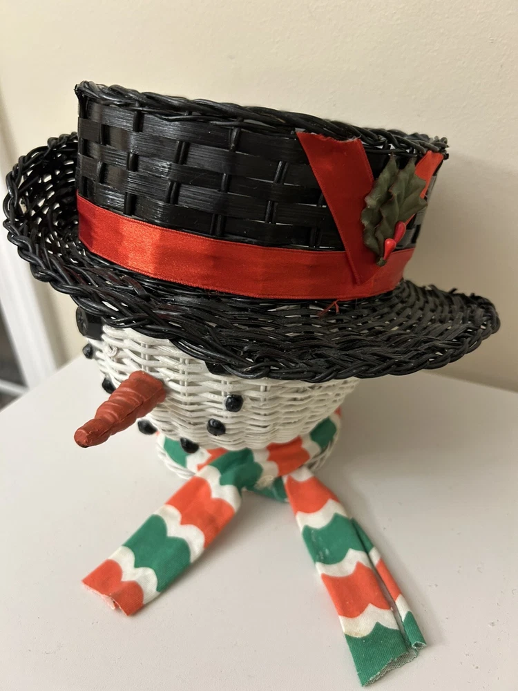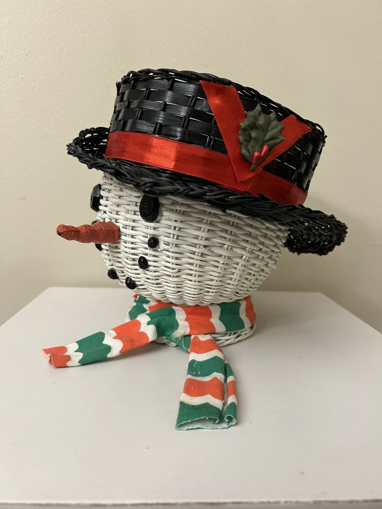 Vintage Large Wicker Rattan Snowman Frosty Head Hat Planter Basket Hand Painted Approximately 8.25” H and 6” W Good condition- refer to pics With Plastic insert