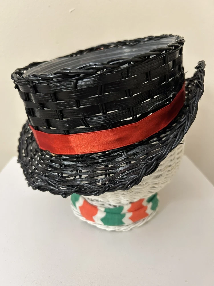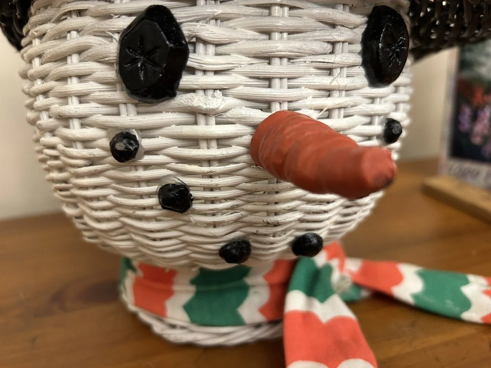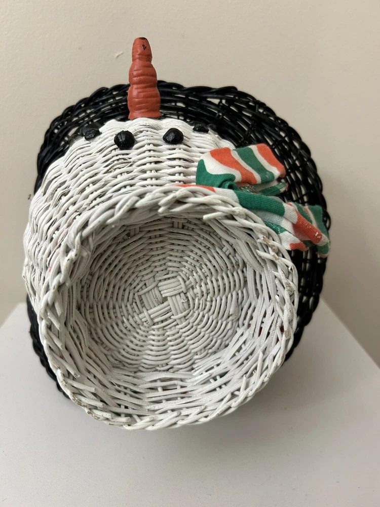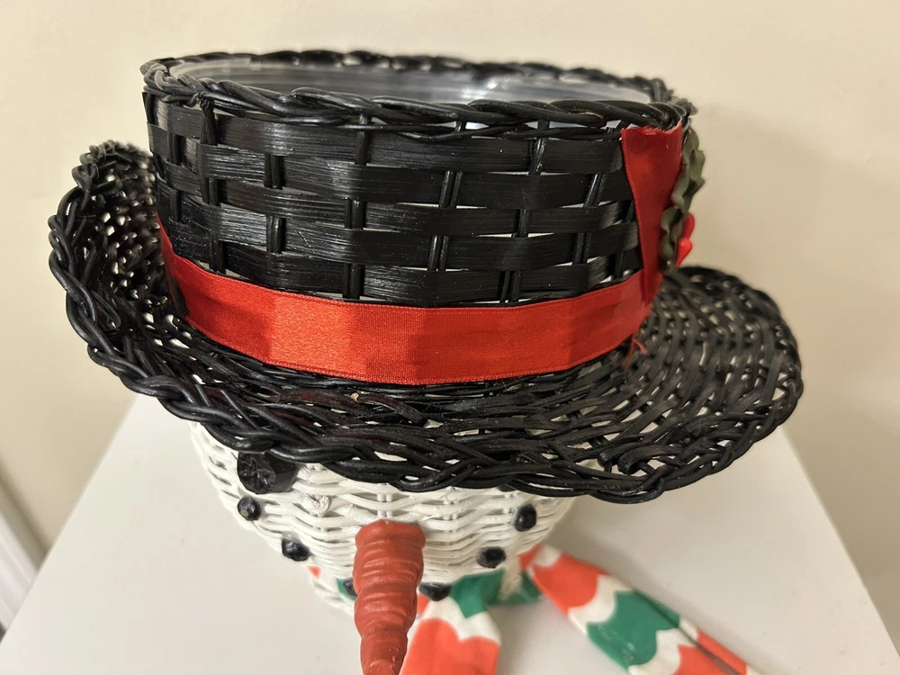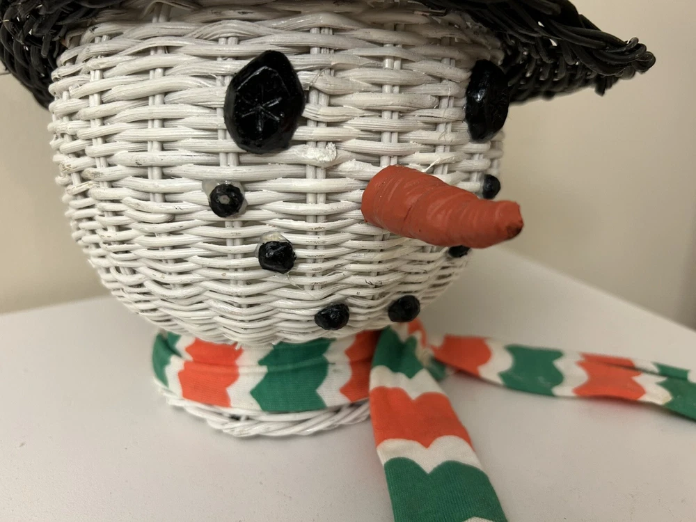 Vintage Large Wicker Rattan Snowman Frosty Head Hat Planter Basket Hand Painted Approximately 8.25” H and 6” W Good condition- refer to pics With Plastic insert
