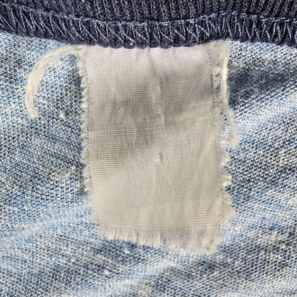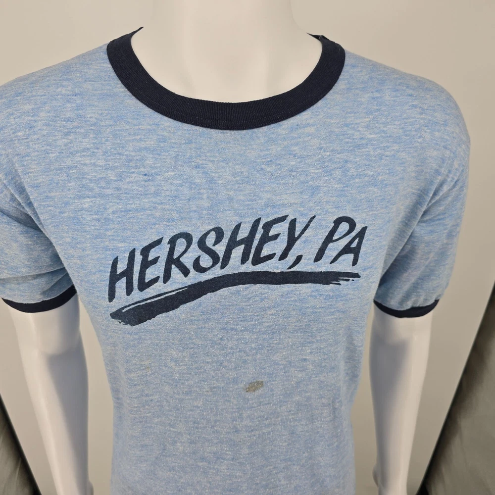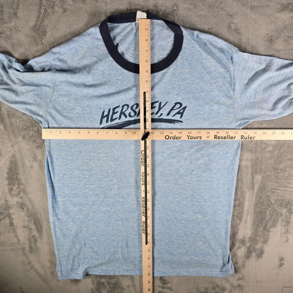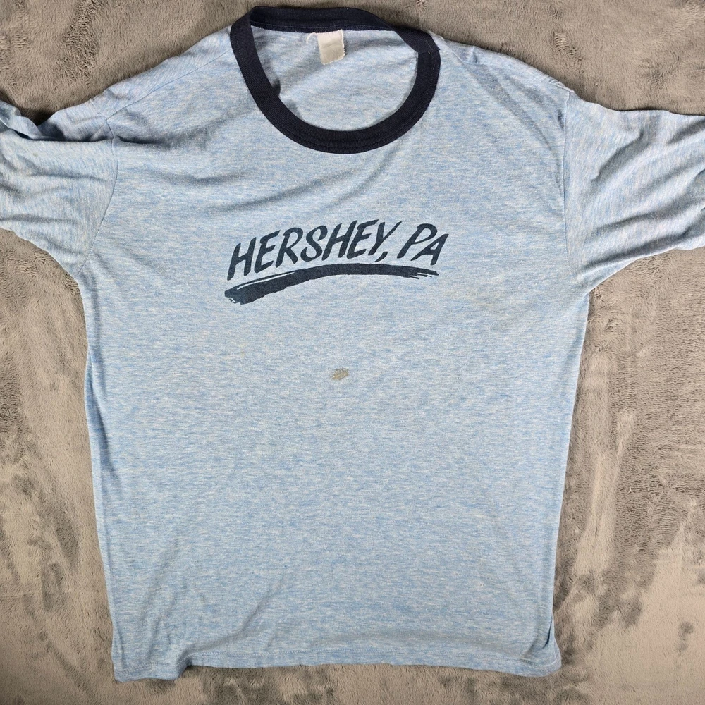 ๐น Item Details: Brand: Unknown (tag illegible) Material: Unknown (but almost certainly poly-cotton blend) Color: Blue Decade of Manufacture: Late 1970s or early 1980s (leaning slightly towards early 1980s) Country of Manufacture: Unknown (likely USA) Notable Features: Ringer Tee ๐น Condition Notes: Fair to good used condition. Thematically appropriate chocolate stain on the front. Moderate to heavy fabric pilling throughout. See photos. ๐น Size Notes: Vintage Tag Size: Unknown (tag missing) Modern Measured Size: Large ๐น Measurements (Approximate): Chest (pit to pit): 43 inches Collar to Hem: 28 inches ๐น Shipping & Returns: Ships worldwide from Lexington, KY. Ships within 3 business days of purchase. Returns accepted within 60 days for domestic orders and 30 days for international orders.