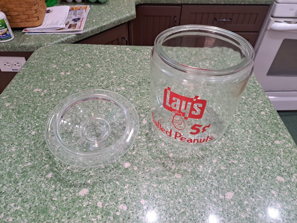 The product is a vintage Lay's Salted Peanuts glass counter jar, featuring the branding of Planters Nuts. This rare find from a general store includes the original lid, adding to its collectible value. The jar is a unique piece of advertising memorabilia from the United States, perfect for those interested in vintage food and beverage items. Its candy and nuts theme adds to its nostalgic appeal, making it a sought-after item for collectors looking to add a piece of history to their collection.