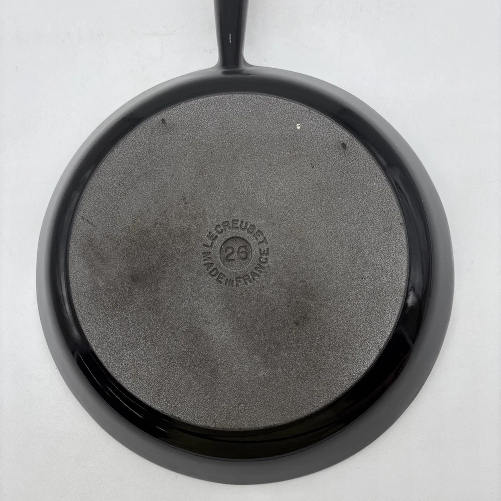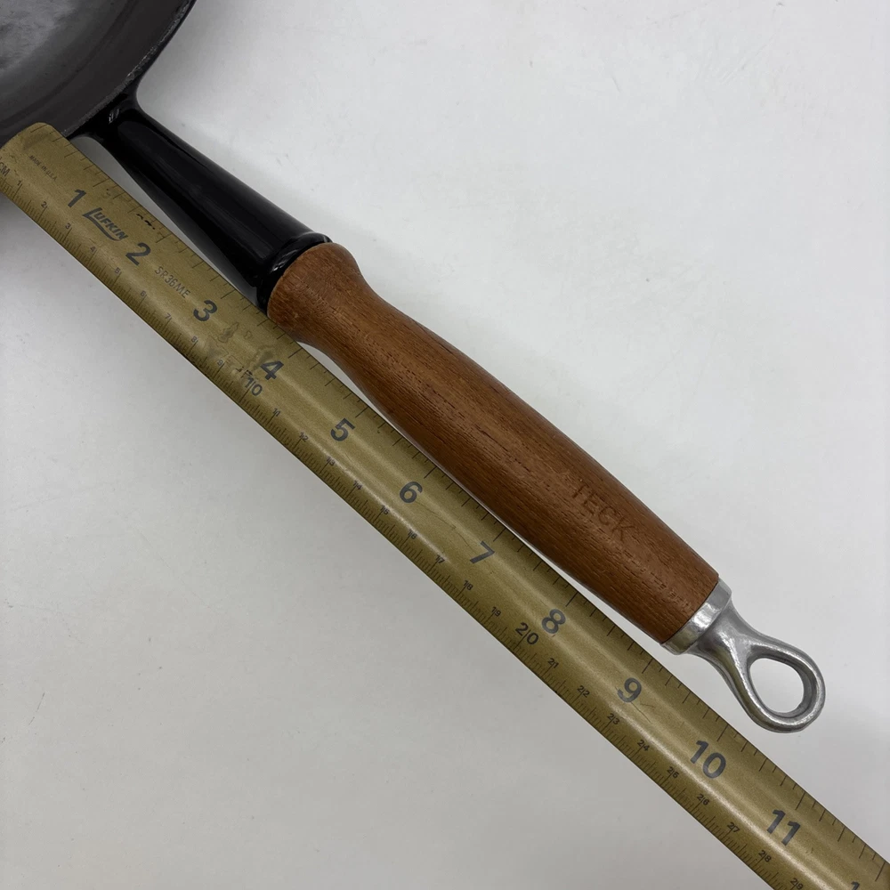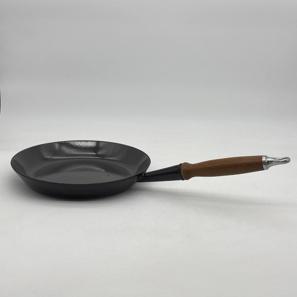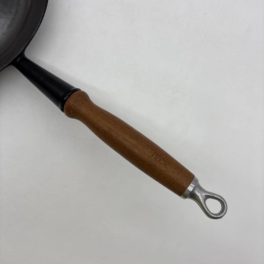 Pan is warped and rocks slightly from front to back. There is also a small chip in the enamel on the inside bottom of the pan. Please see pictures. Otherwise, the enamel is in fantastic shape! Pan features a long wooden handle. Ships with handle detached.