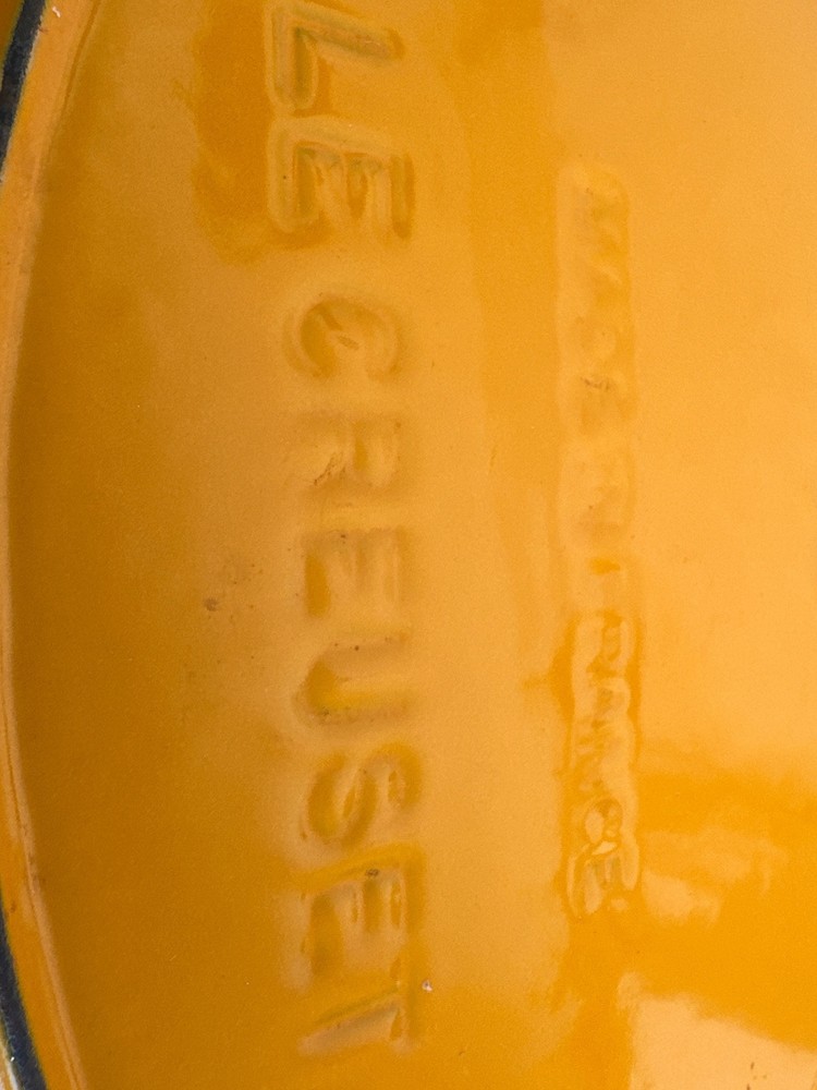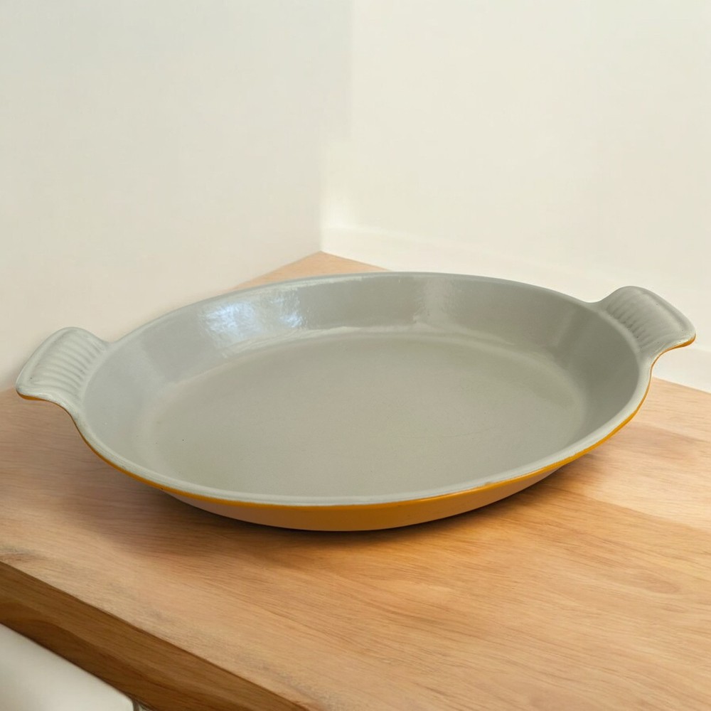 Vintage Le Creuset #32 Yellow Oval Casserole Baking Dish from France. Made of cast iron with enamel coating, this casserole dish is electric and gas stove compatible. It features a flat bottom, double handles, and is oven-safe. This piece is an original Le Creuset product, making it a collectible cookware item for any kitchen. 14.75” L - handle to handle 9.25” W 1.875” H - at center 2.5” H - at handle