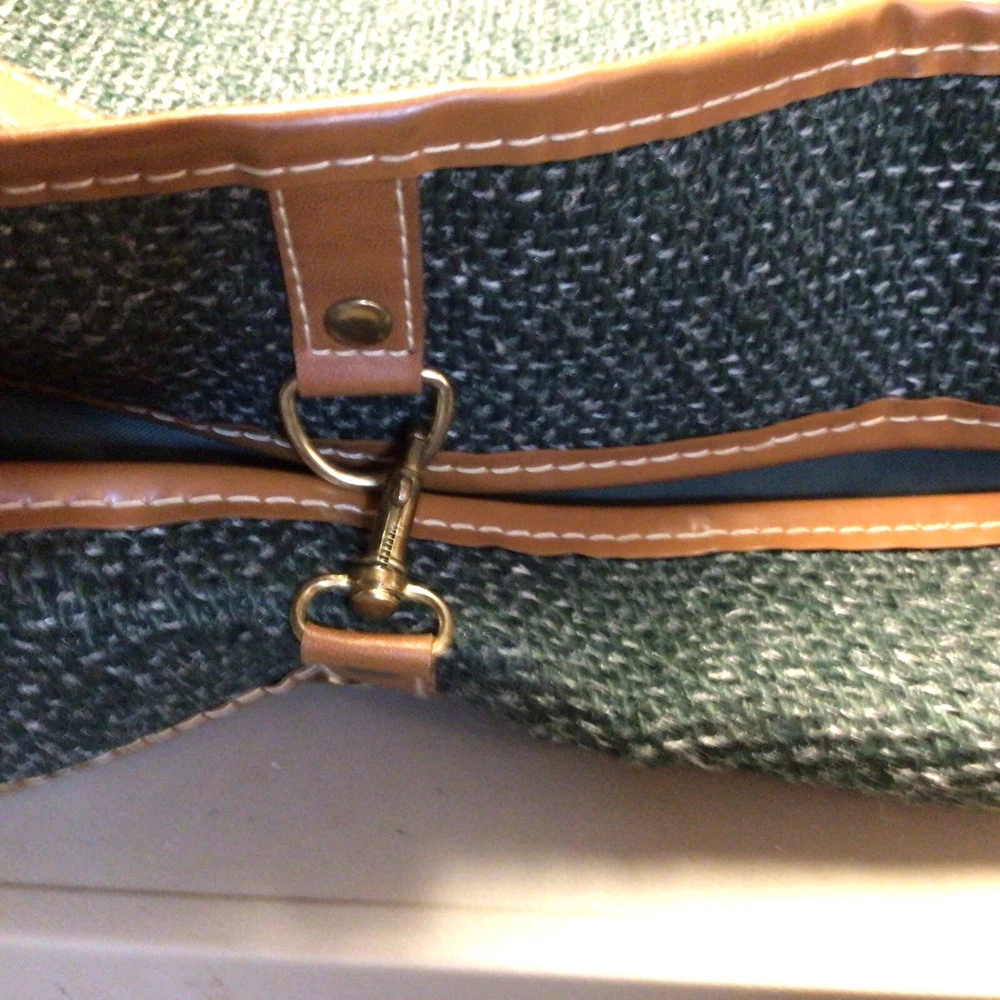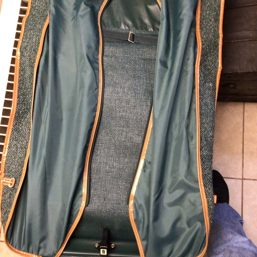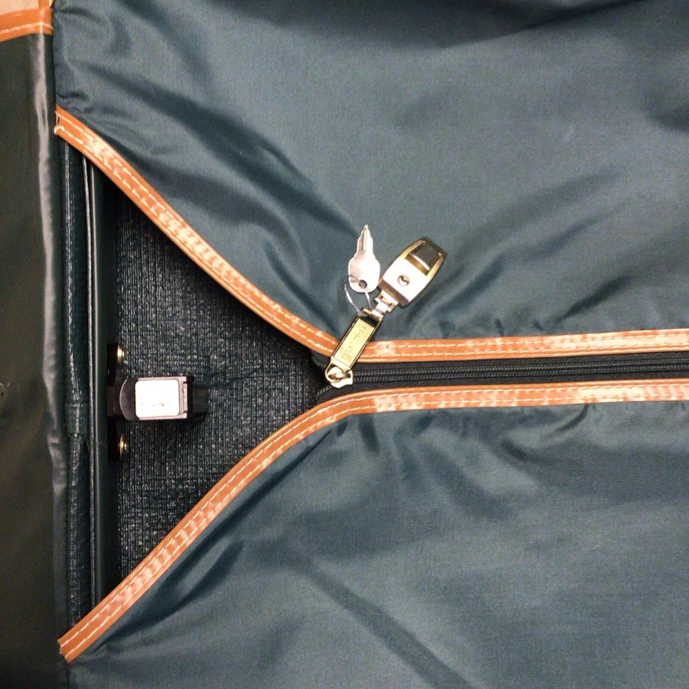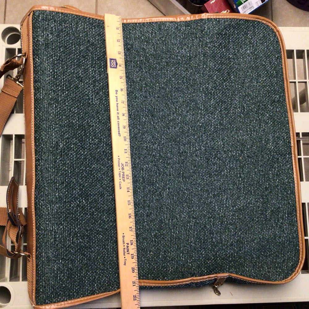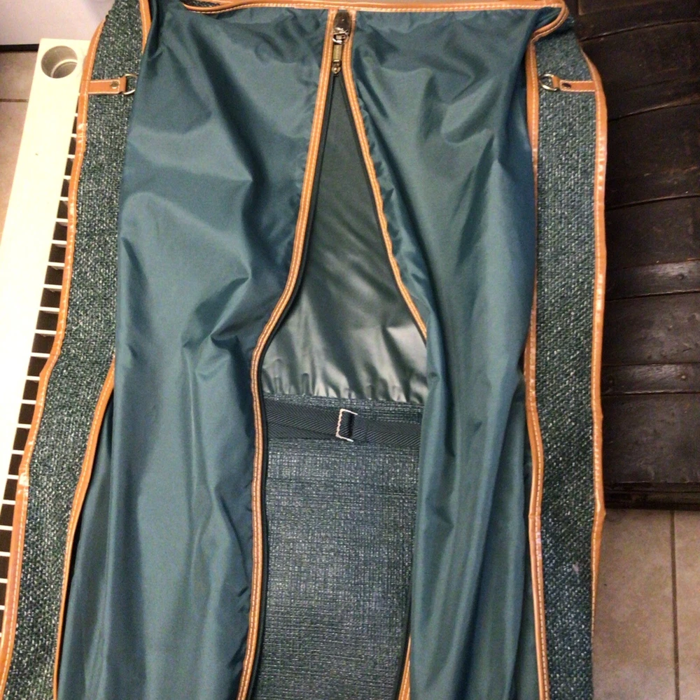 The "Vintage Garment Bag by Frequent Traveler" is a 20" when folded in half, green canvas garment bag designed by Henry Rosenfeld Luggage in Syracuse, New Jersey. It features adjustable straps, a clothing compartment, and a locking mechanism for added security. This unisex adult garment bag is suitable for carry-on use and is made in China. Perfect for storing and transporting clothing while on the go, this bag combines functionality with a retro style that appeals to those who travel often. Don’t believe that it has ever been used. Comes with original lock and key. Measures approximately 20 inches when folded, approximately 44 inches open. Nice bag. Please look at the pictures closely, as this is the item that you will receive.