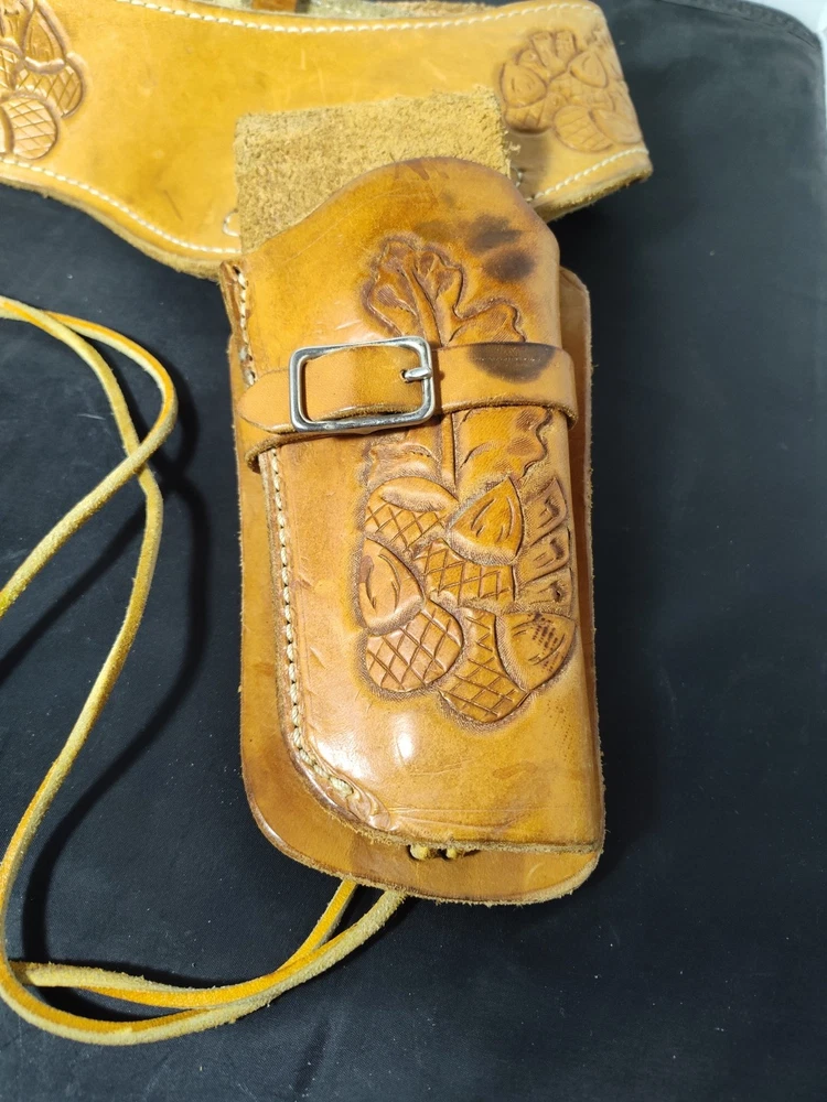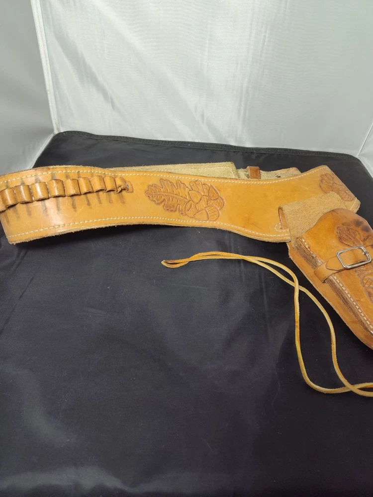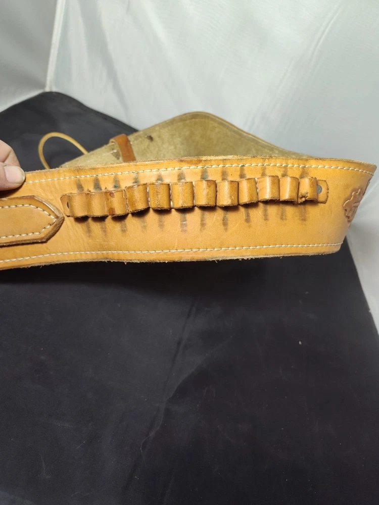 This vintage leather Western hand-tooled gun belt holster is perfect for right-handed cowboys who prefer a horse steer. It's compatible with a variety of guns including Ruger, Remington, and Heritage models in .45 Colt, .22 Magnum, and .44 Magnum calibers. The holster is designed for a hip carry location and features a 3 o'clock position for easy access. Crafted from high-quality leather, this holster is durable and comfortable to wear during shooting sports and hunting activities. It can accommodate one magazine and is a perfect fit for revolvers and pistols. This holster is an excellent addition to your collection, and it's sure to impress your friends and family. It holds 12 extra bullets in the side aswell. See photos before purchase please as there are some discolorations in the leather.