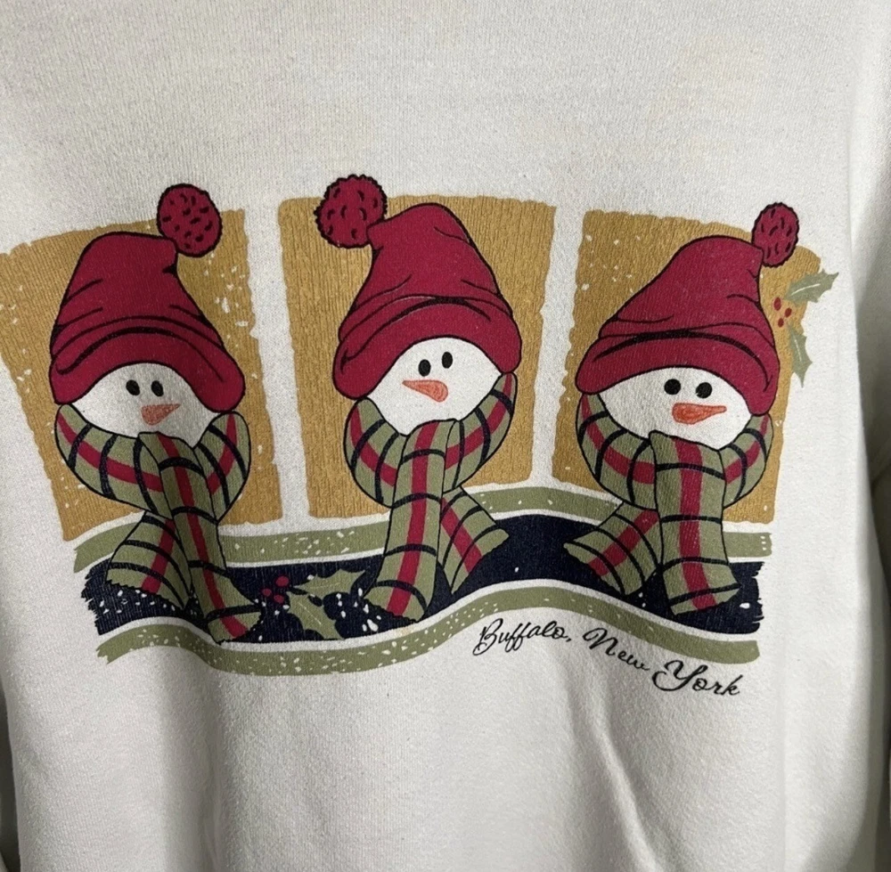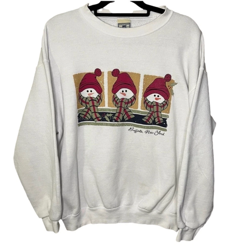 Vintage Lee Heavyweight Unisex L Buffalo NY Snowman Holiday Long Sleeve Sweater Sweater is in good pre-owned condition. No defects or stains. Smoke free and pet free home. Cotton blend material. Pit-23”, length-25”, and sleeve-20”. We list new stuff everyday! Feel free to send offers anytime! Please review all pictures and ask any questions you’d like before purchasing! Shipping next business day! Get ready for the holiday season with this vintage Lee sweater featuring a cute snowman design. Made of tight-knit cotton fabric, this unisex pullover has long sleeves and a crew neckline for a comfortable fit. The sweater is a size L and comes in solid white color, with a Lee logo accent adding a touch of style.