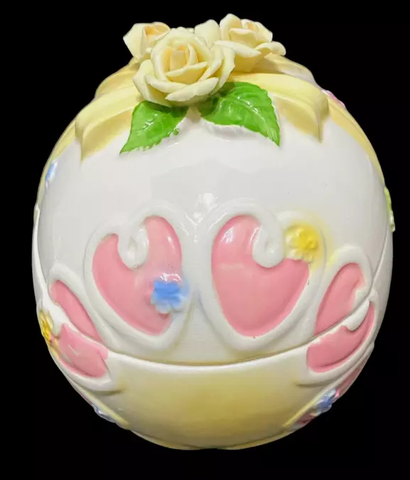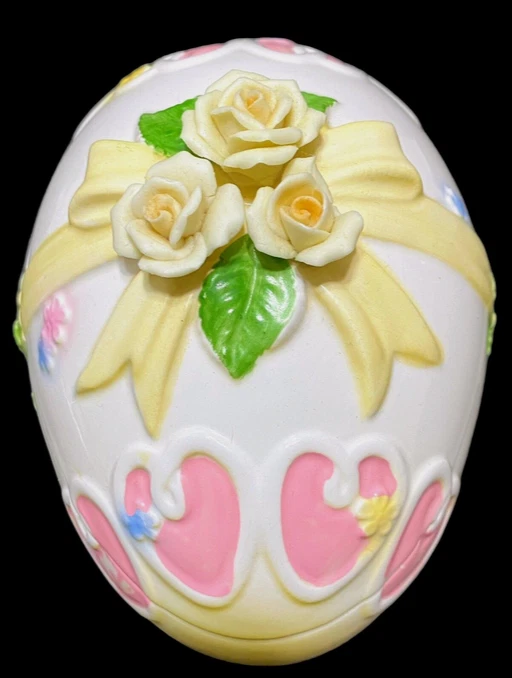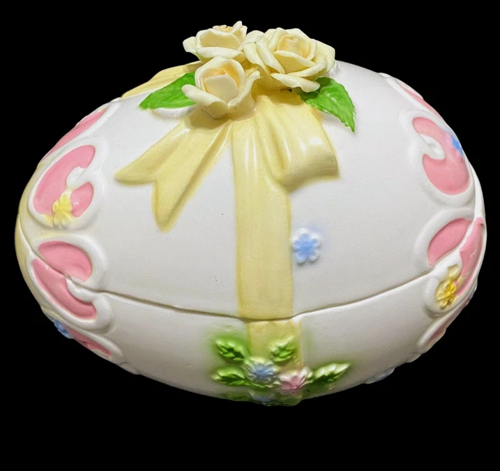 HomeVintage Lefton Easter Egg Trinket Dish Bisque Applied Yellow Roses on Lid