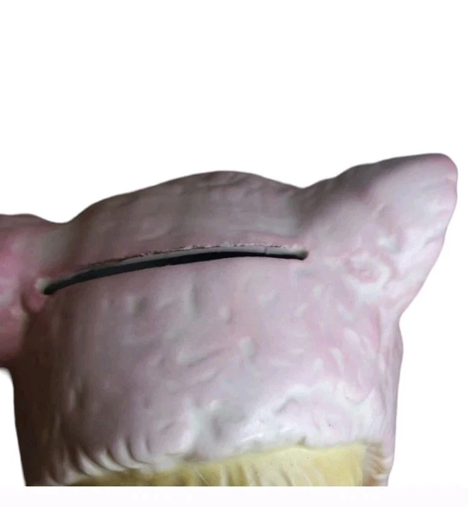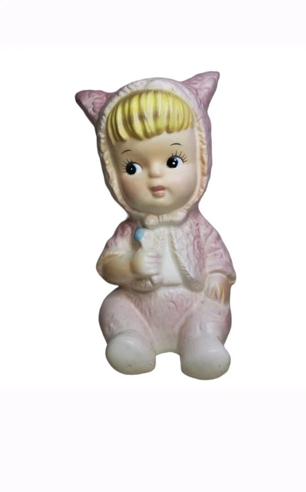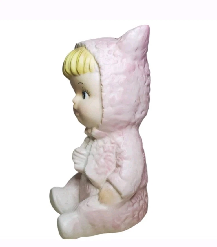 Adorable money bank 🍭 Little girl in pink fleecy pink pajamas with pointed ears Some fleabites by coin slot 6.5" high No visible cracks