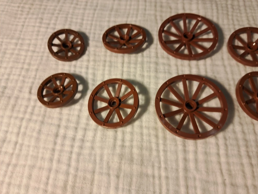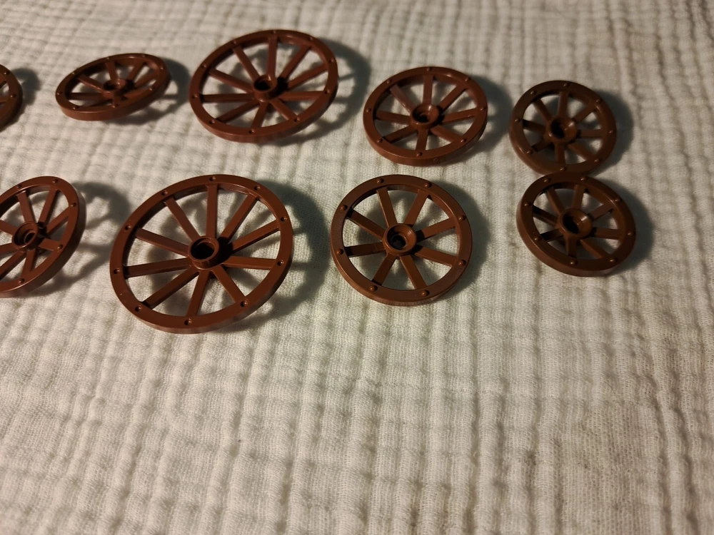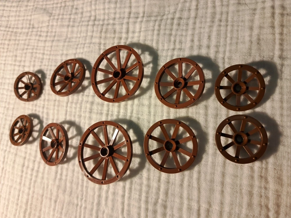 Lot of 10 wheels, 3 sizes: 4small, 4medium, and 2 large. All brown
