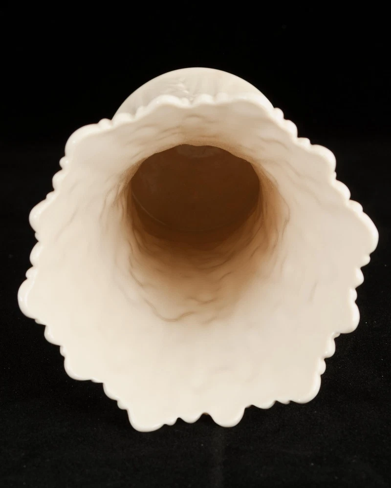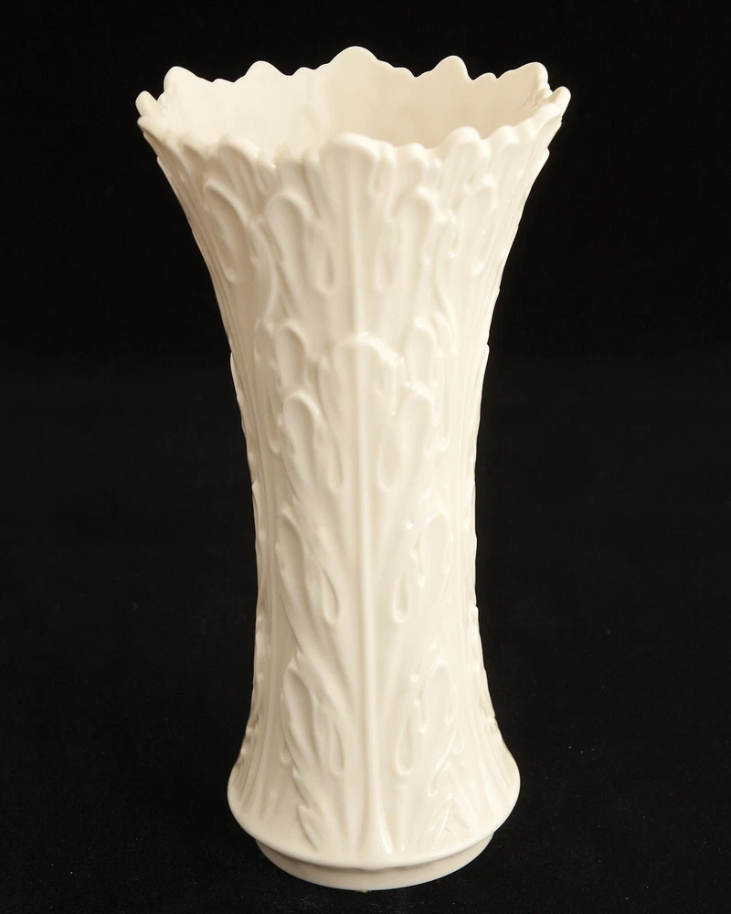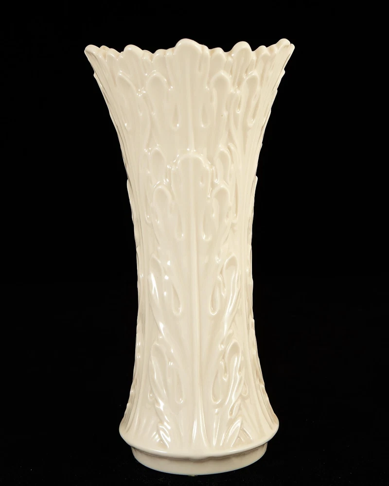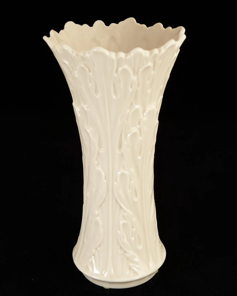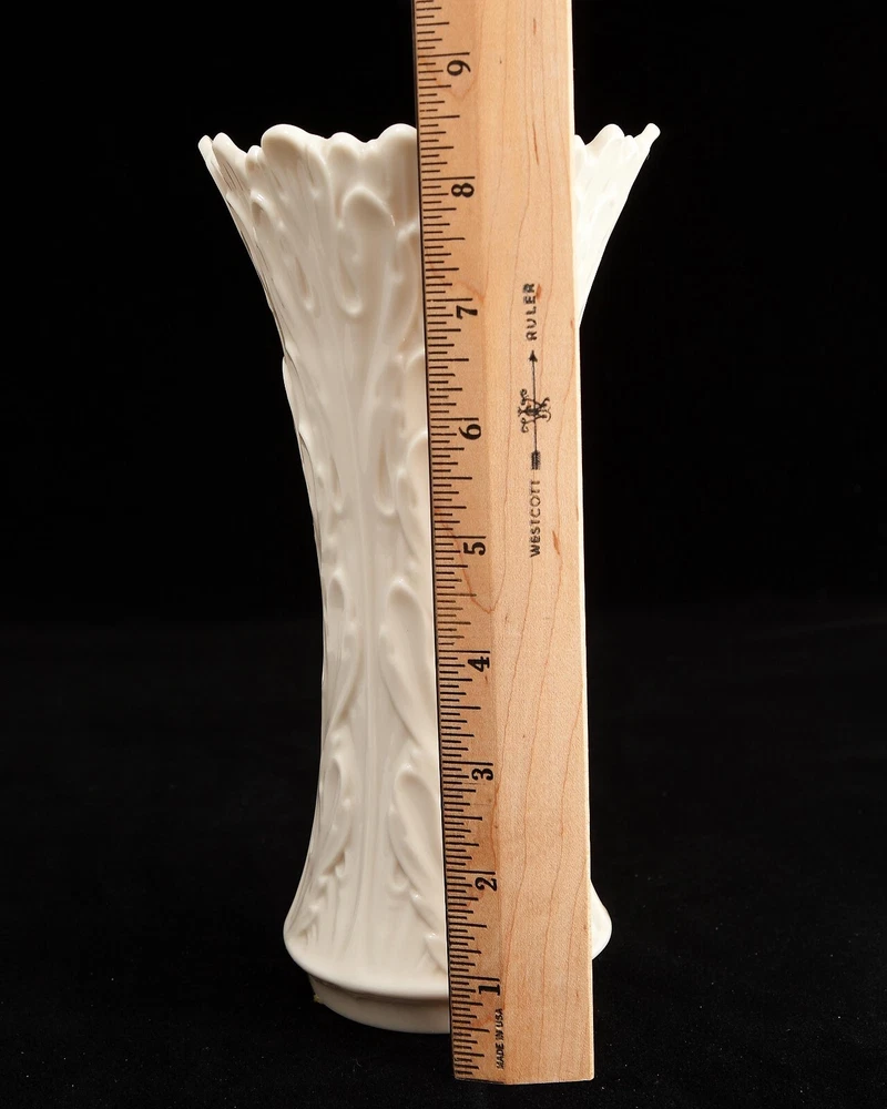 This vintage Lenox bone china vase features a Woodland Acanthus leaf pattern in ivory color. Made in the United States in the 1980s, the vase stands at 8.5 inches tall with a base width of 2.75 inches and a mouth width of 4.5 inches. The raised/scalloped design adds a traditional touch to the piece, making it perfect for all occasions And it's a unique piece of history: this piece was manufactured in the Lenox factory in Kinston, NC - before they were bought-out and production was moved overseas. The embossed finish and quality craftsmanship make this Lenox vase a beautiful and elegant addition to any decor.