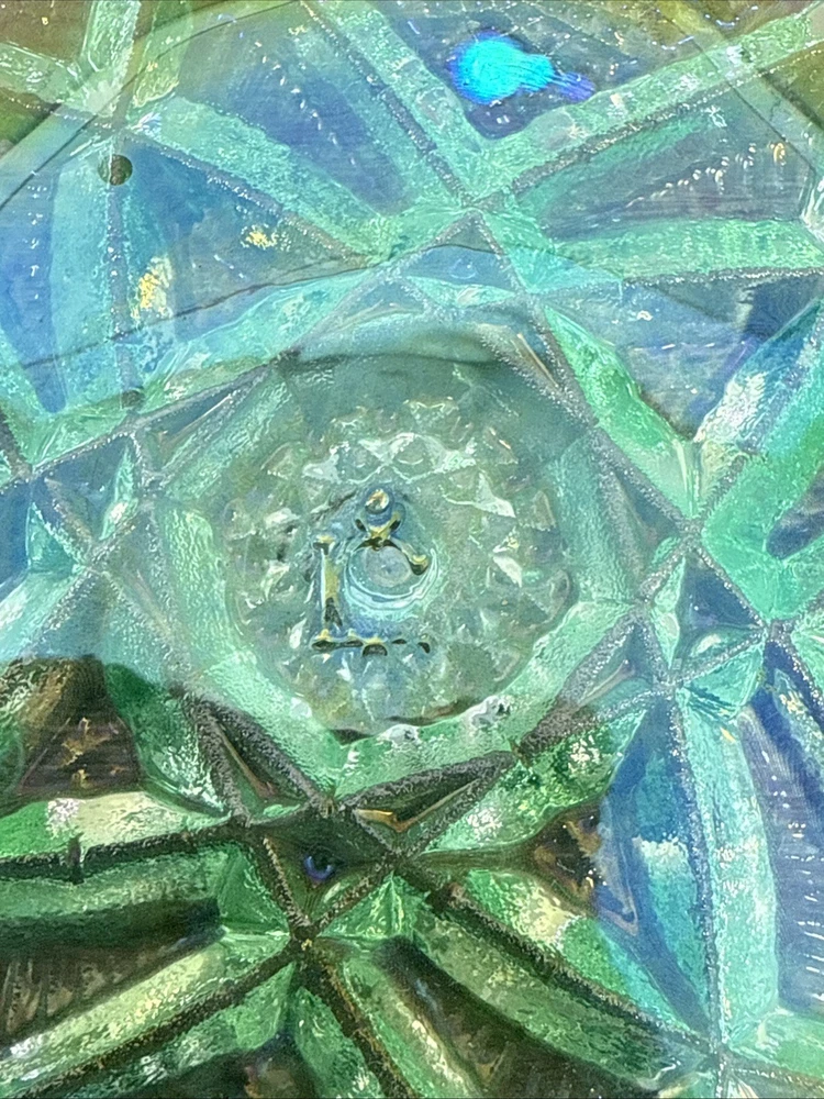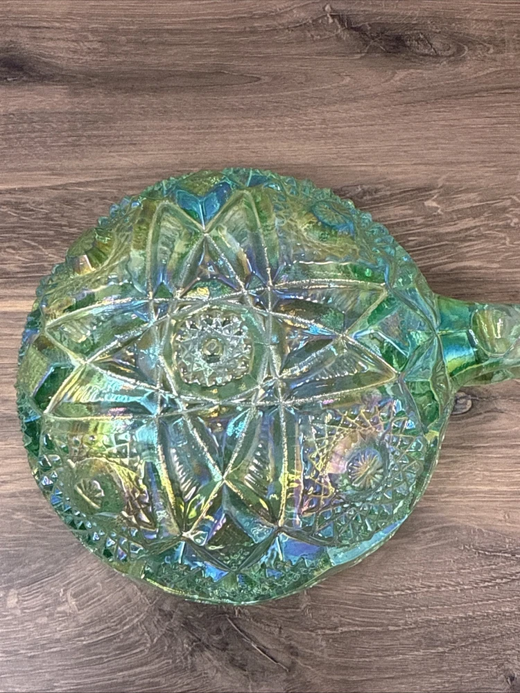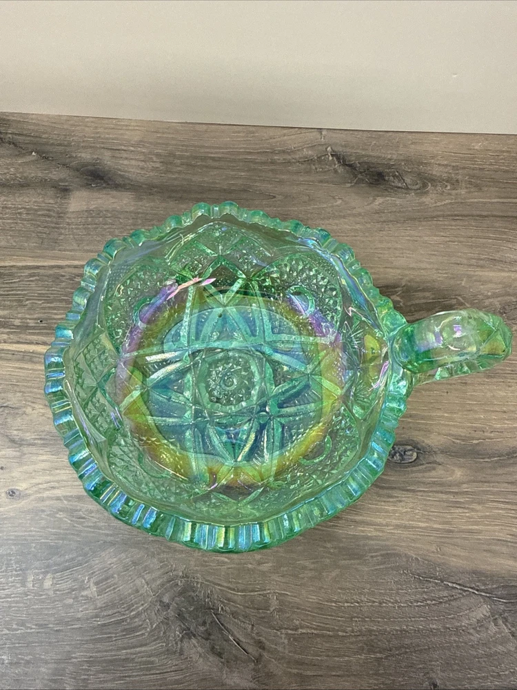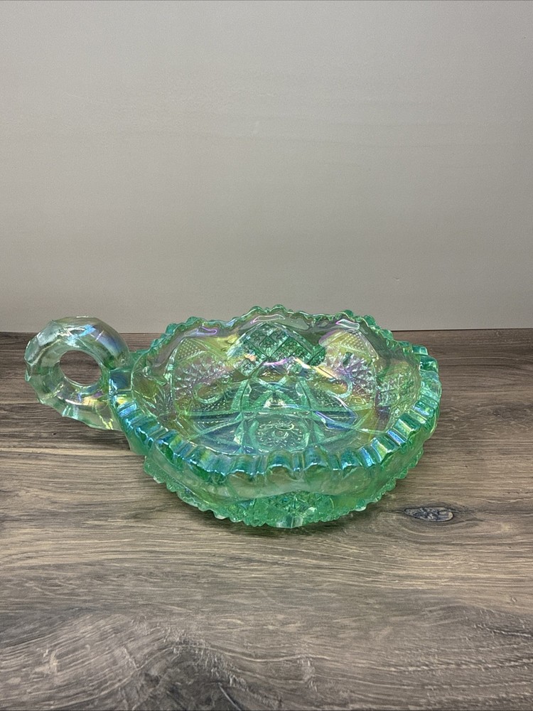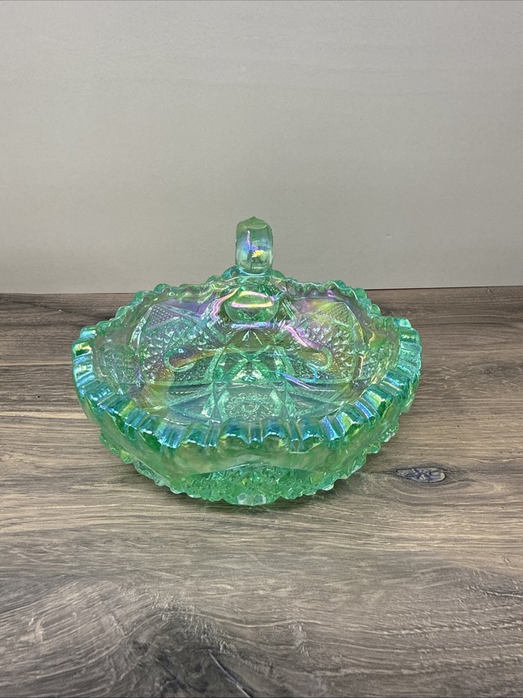 The product is a vintage Imperial Glass by Lenox saw tooth mint green carnival dish. This collectible item features a unique turquoise color and is made of glass. Perfect for decorative collectors, this dish adds a touch of vintage charm to any space with its intriguing design and historical significance. Ideal for displaying or using as a conversation piece, this piece of decorative glassware is sure to be a standout in any collection.