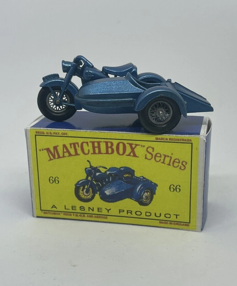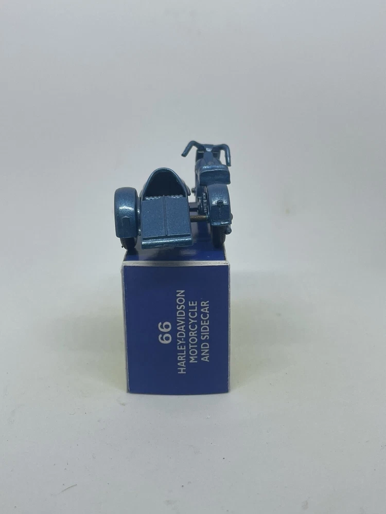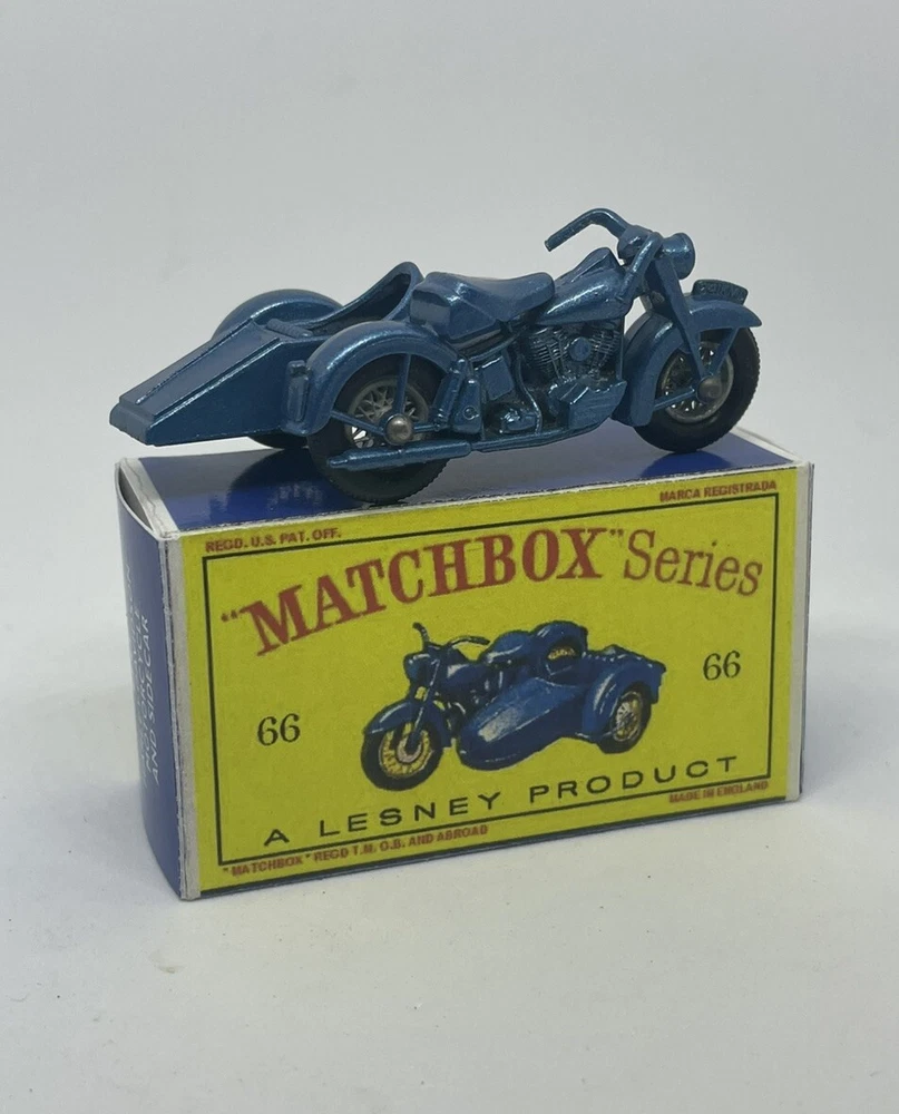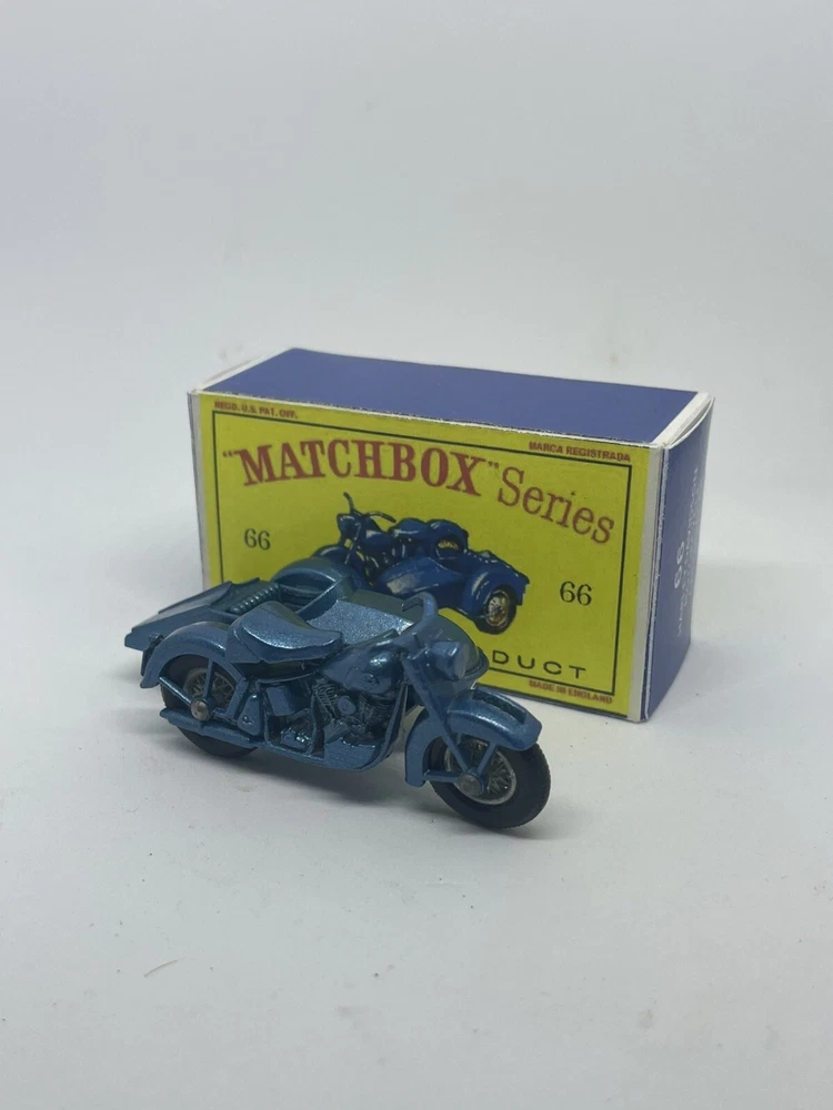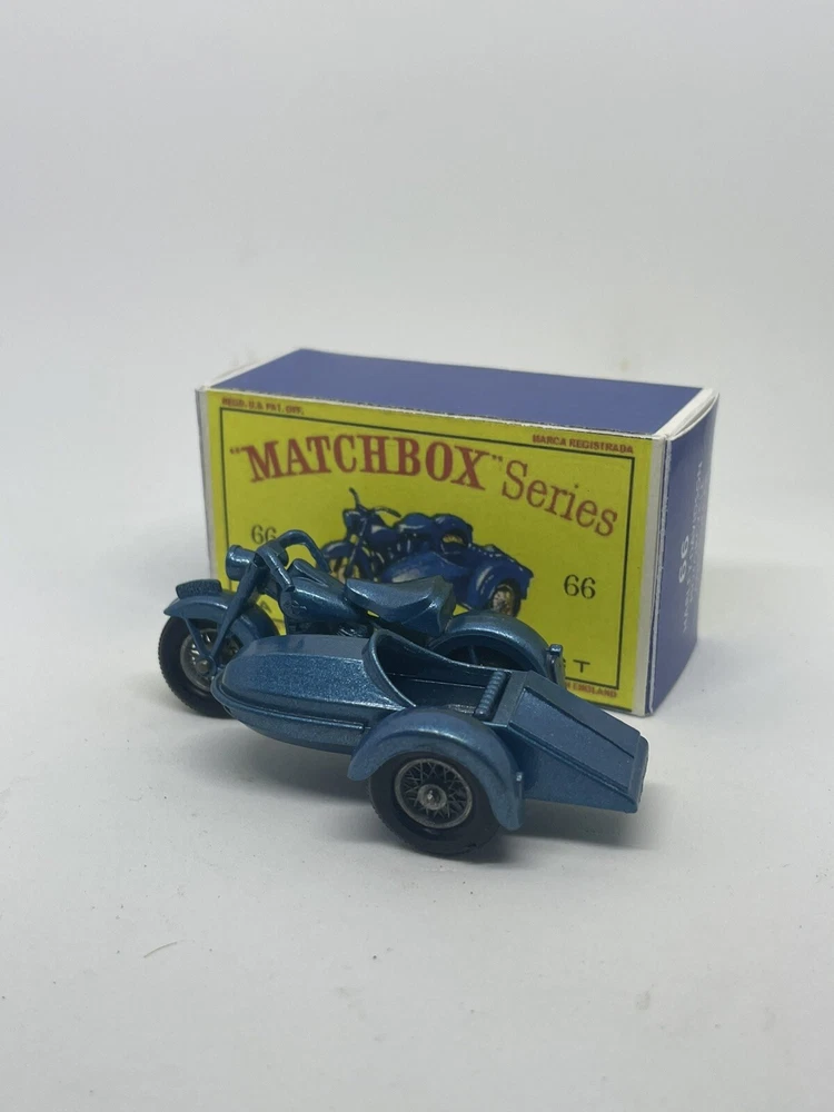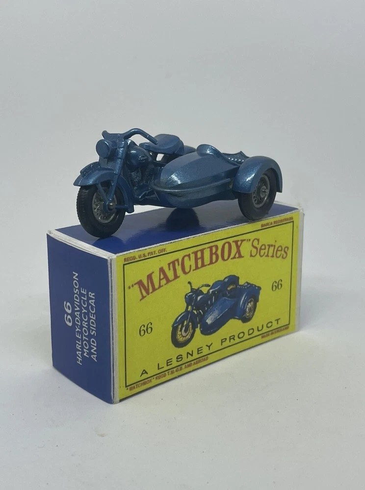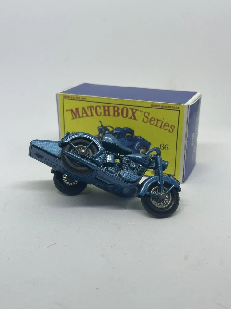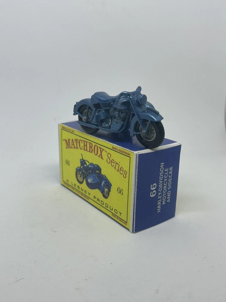 Vintage Lesney Matchbox 66 Custom blue Harley Davidson sidecar RESTORED, NOT ORIGINAL. I restored the vehicle to a high standard. My new displayable storage reproduction box and replacement Grey hook. These models and packaging are not original. Please look at the pictures carefully as they are part of the description. Please ask questions before bidding. I combine shipping with multiple orders. These are custom models so I do not except returns. This is a hobby and the vehicle was a used played with toy now restored.