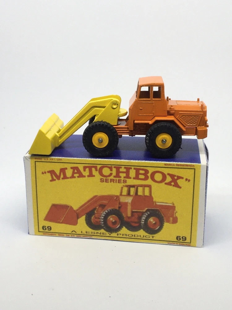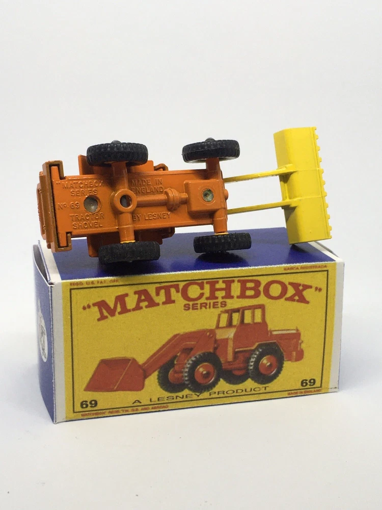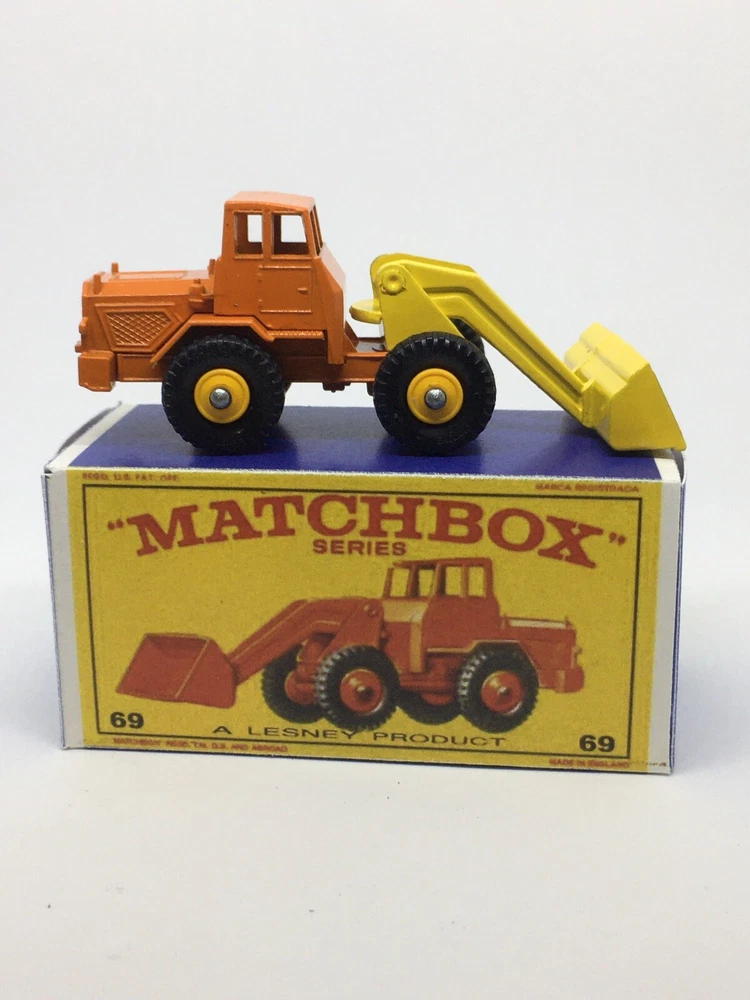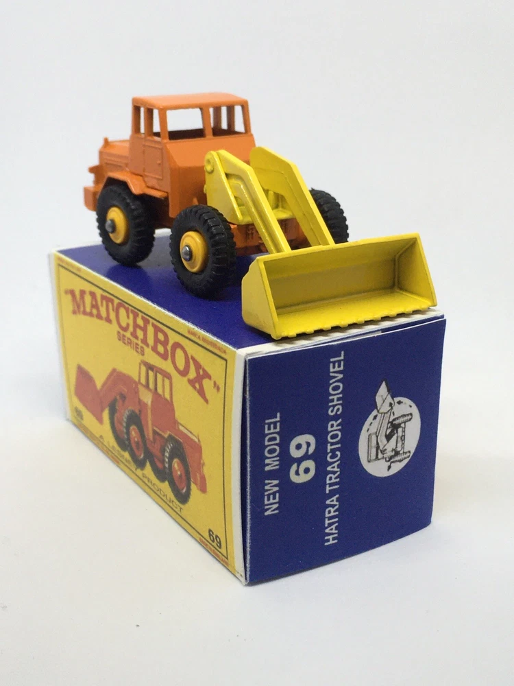 Vintage Lesney Matchbox 69 Hatra Shovel. Rare two colors Transitional. RESTORED, NOT ORIGINAL. Fixed shovel. I restored the vehicle to a high standard with a new displayable storage box. These models and packaging are not original. Please look at the pictures carefully as they are part of the description. Please ask questions before bidding. I combine shipping with multiple orders. These are custom models so I do not except returns. This is a hobby and the vehicle was a used played with toy now restored.