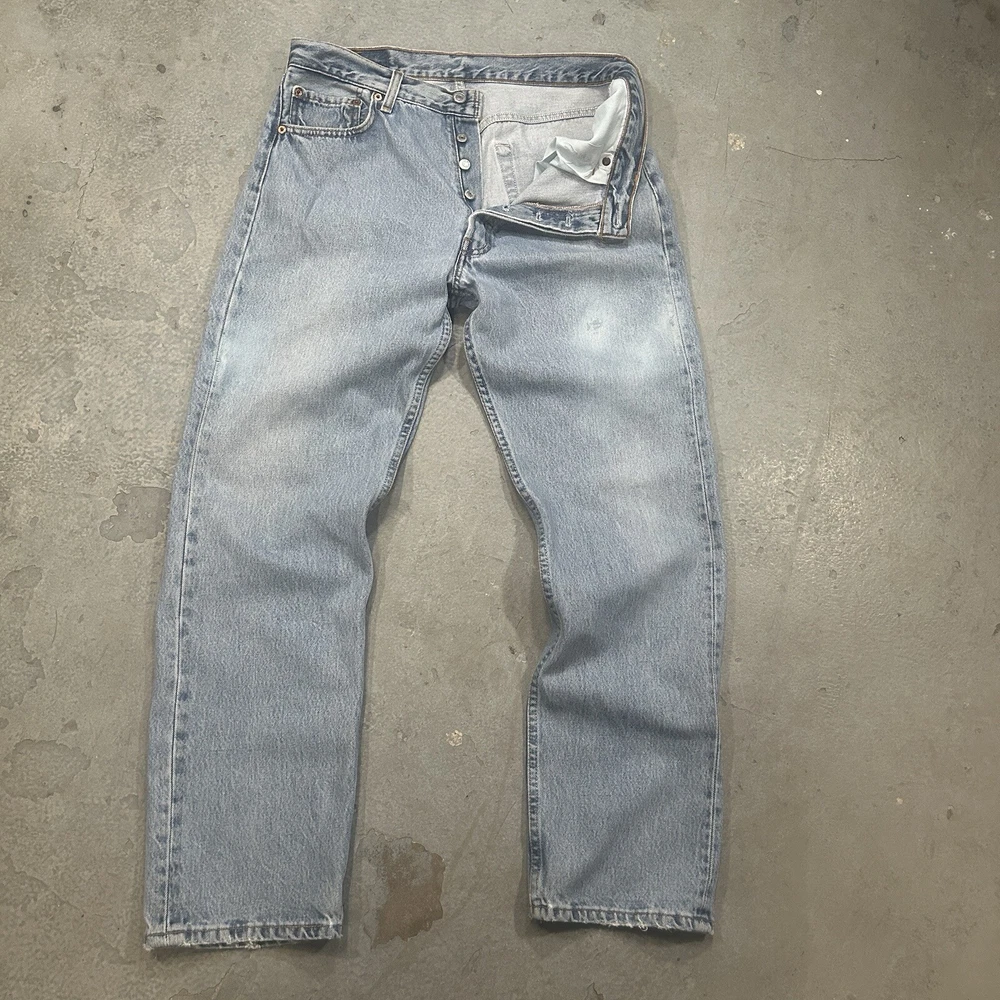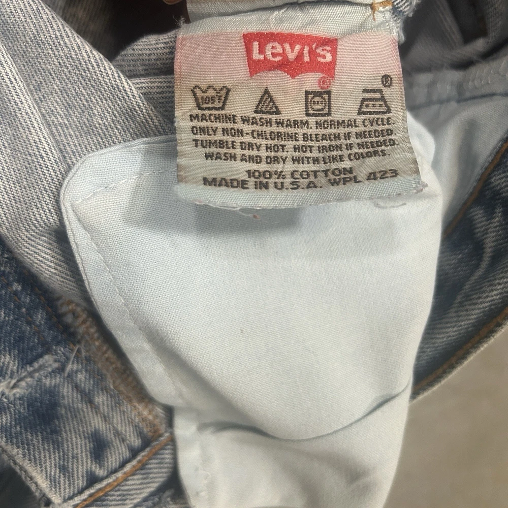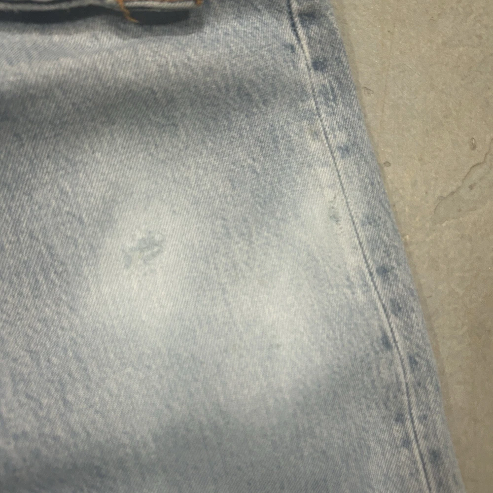Minor staining and distressing as shown in photos 34” x 30” Super light wash Fire fit Butterfly button closure 5 pocket design Made in USA Jan 1993 production date Shipped same day