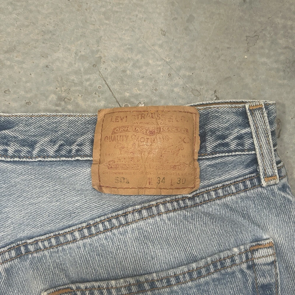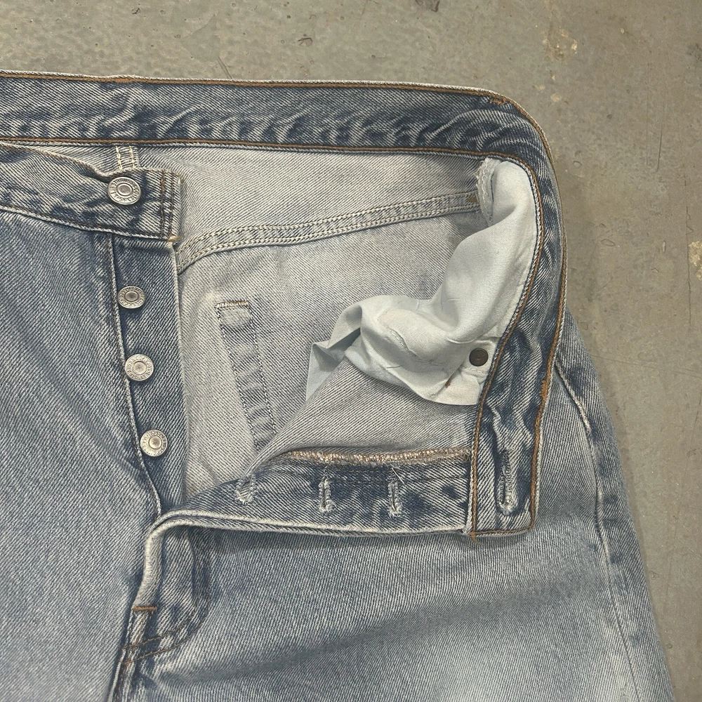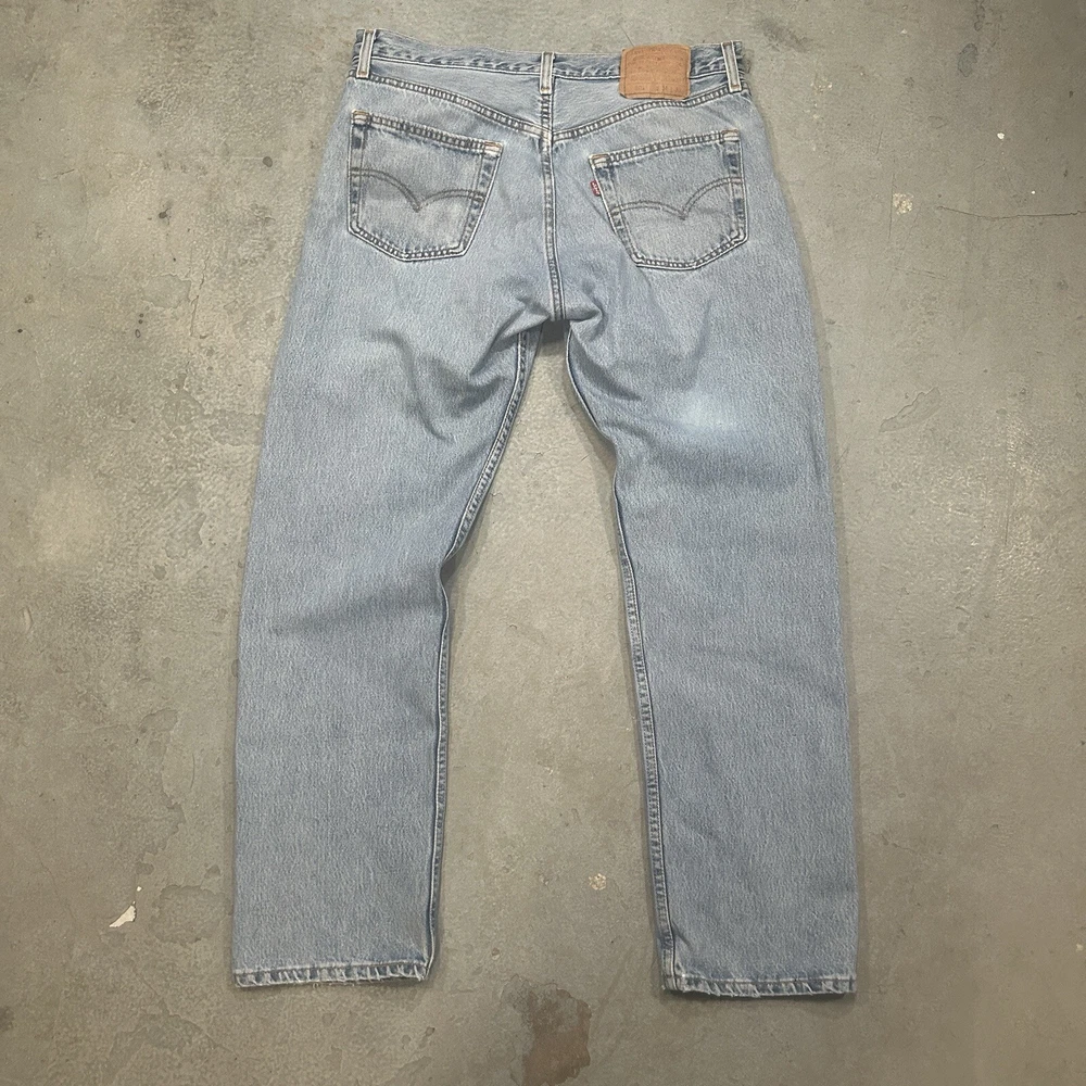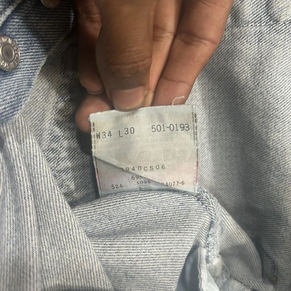 Minor staining and distressing as shown in photos 34” x 30” Super light wash Fire fit Butterfly button closure 5 pocket design Made in USA Jan 1993 production date Shipped same day