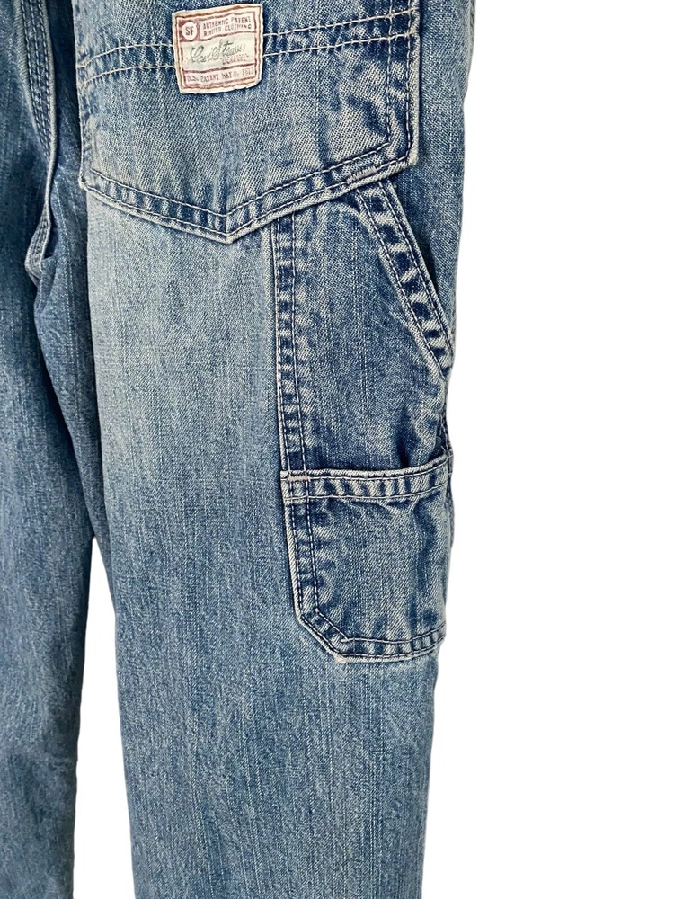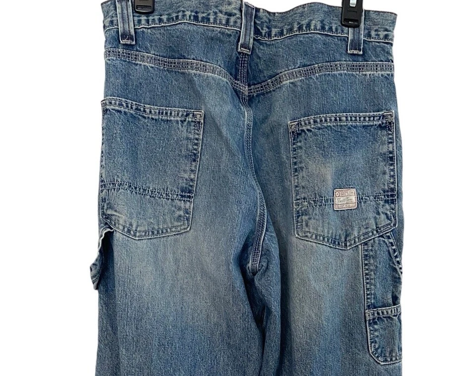 Embrace the vintage look with these Levi's Carpenter Loose Straight Jeans. The blue denim fabric with a medium wash and solid pattern is perfect for any season. The jeans feature a wide-leg style, hammer loop, comfort, and pockets including a carpenter pocket, 5-pocket design, and coin pocket. The button closure and Levi's logo accents add a touch of classic and skate style, making them perfect for any occasion. These jeans are machine washable, have a waist size of 34 inches, and inseam of 31 inches. They are made of 100% cotton and are perfect for men who want a relaxed fit. The Levi's Carpenter Loose Straight Jeans are a must-have for anyone looking for a Y2K, 90s, or hip hop inspired look. There’s slight distressing on the knees small whole in one otherwise good condition not sure if they were made that way or not