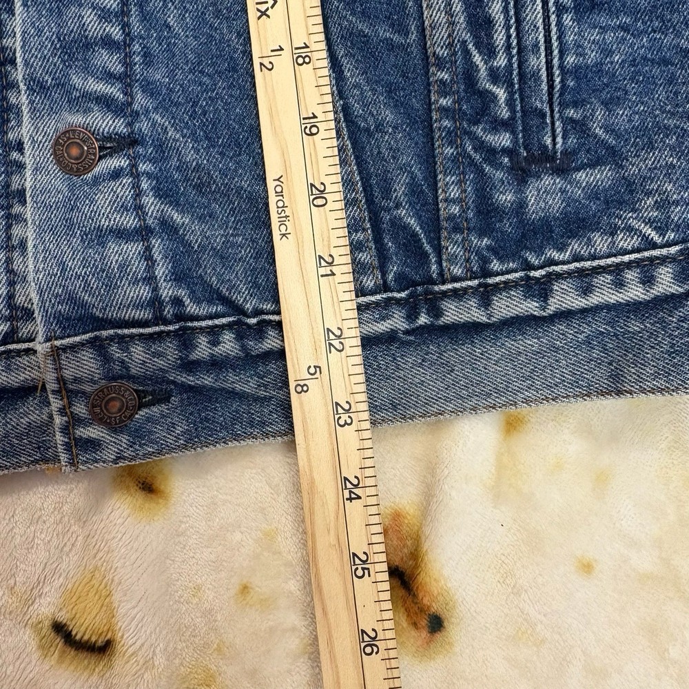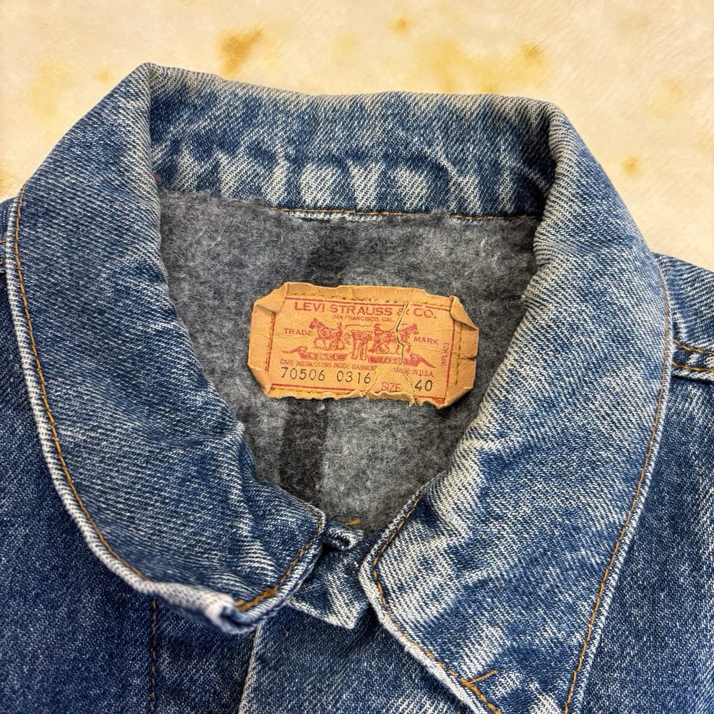 21x23 ; p2p x length The Vintage Levi's Denim Jacket 80s 70506-0217 in Blue is a classic piece of men's clothing that showcases the timeless style of the 1980s. Made in the USA with high-quality cotton denim, this jacket features a button closure, spread collar, and spacious pockets, making it perfect for casual wear in all seasons. The Levi's Trucker jacket is a short-length, regular fit denim jacket with a solid blue color and Levi's logo accents, embodying a retro Western theme and celebrating the iconic denim fashion of the 80s and 90s. BBB