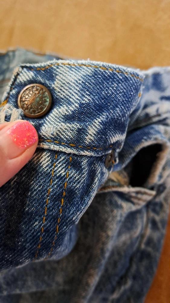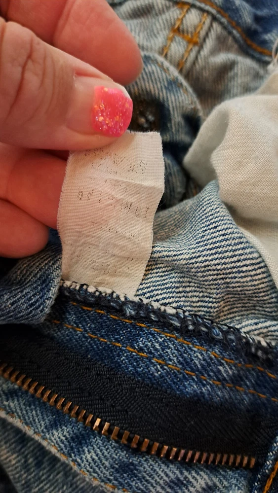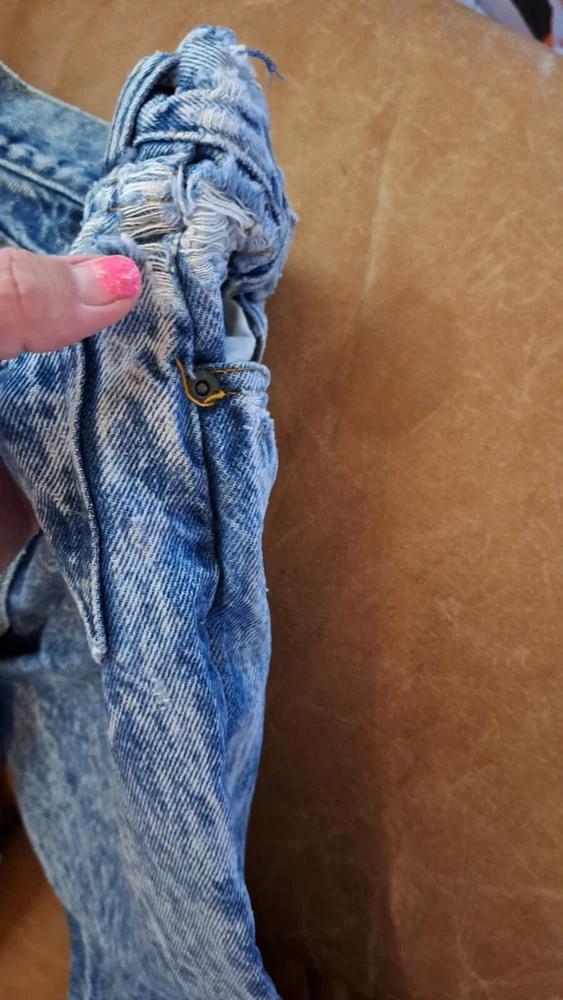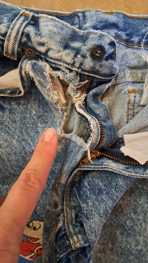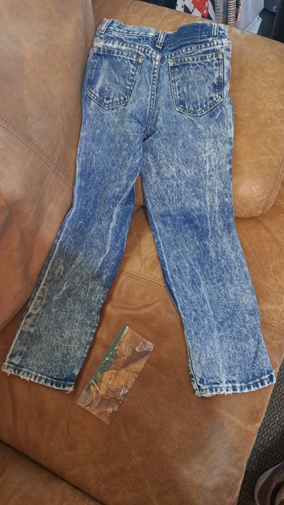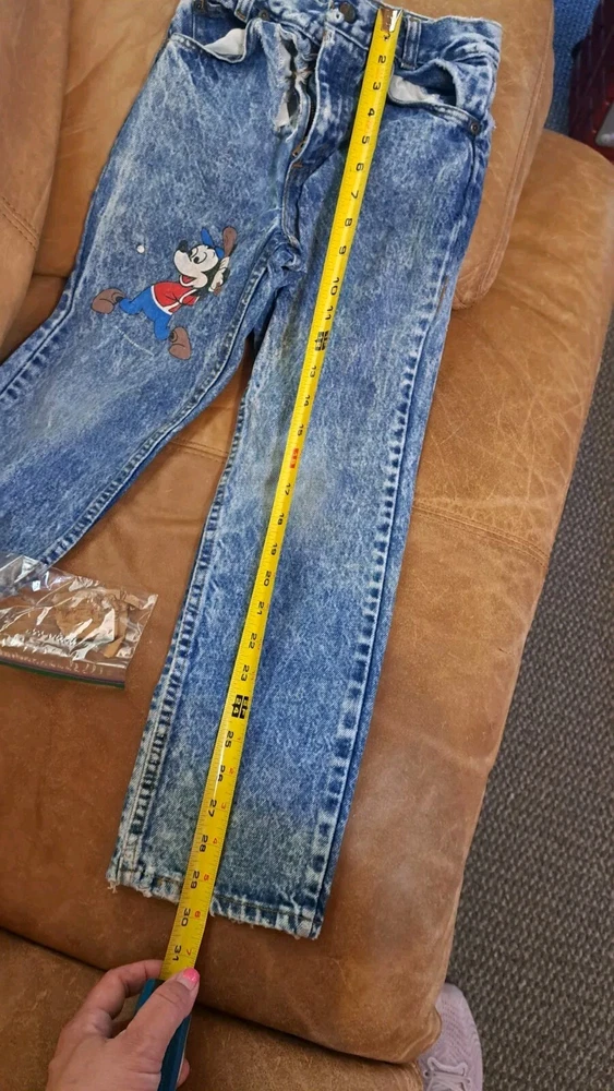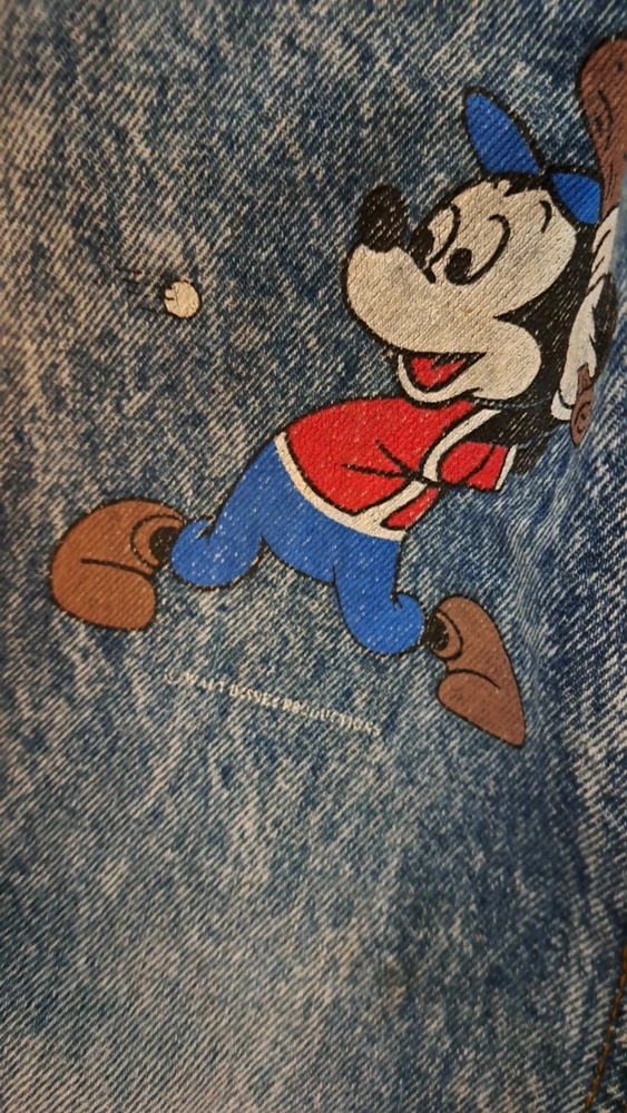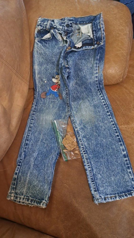 In extremely Preowned condition. This is a vintage pair of Levi's jeans. Mickey hitting a baseball. Size is unknown the tag is very worn, look like it says kids size 10. Not sure though. Measurements are in the pictures. The jeans have multiple rips , holes, button missing. They are definitely a fixer upper pair, or can be used for the mickey emblem, if u want to cut it off and reattach it to something. Also a work or play pair of jeans. The Levi tag is no longer attached. I have it in a zip lock bag. It is ripped, torn and pieces have come off. All I could salvage of it is in the zip lock. Shipped with USPS Parcel select ground.