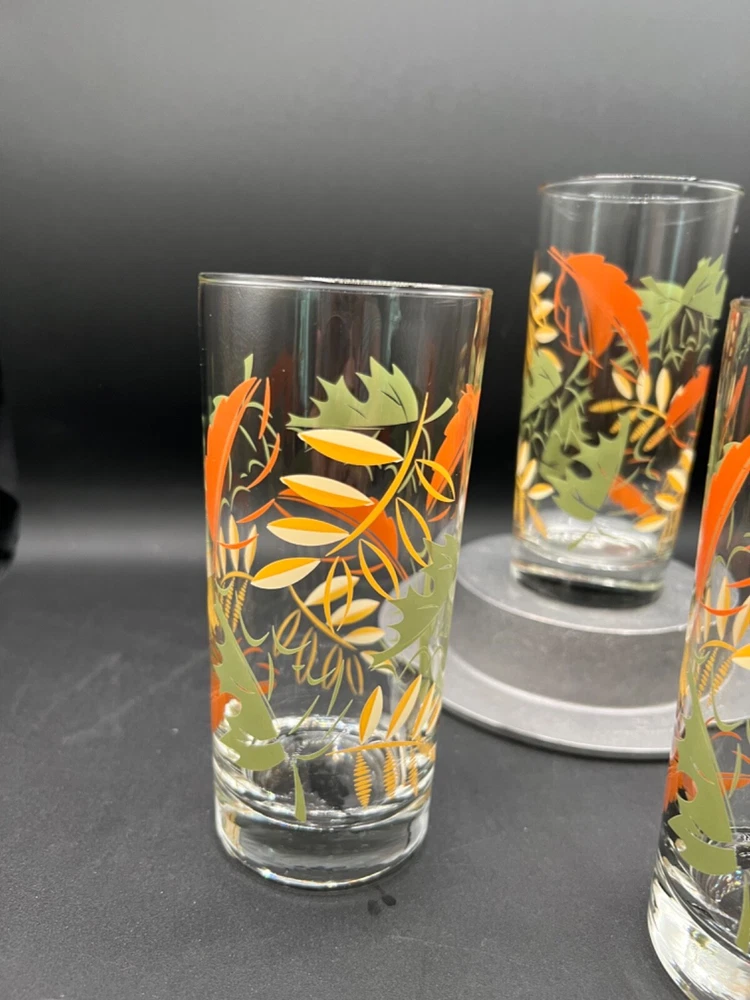 The product is a set of 4 vintage Libbey Crisa tumbler glasses Look alike with a Seasons Leaves pattern, featuring a Mid-Century Modern style in clear glass. These glasses are perfect for drinkware and barware, adding a touch of nostalgia to your collection. Made of durable glass, these tumblers are in excellent condition and can serve as a stylish addition to any home. They are 6 1/2 inches tall and 3 inches wide.