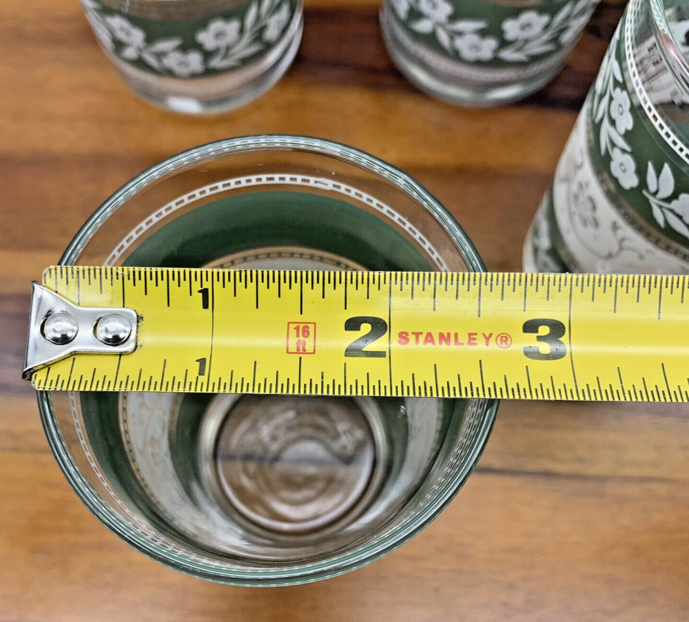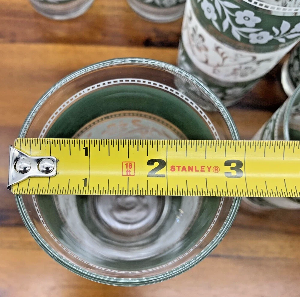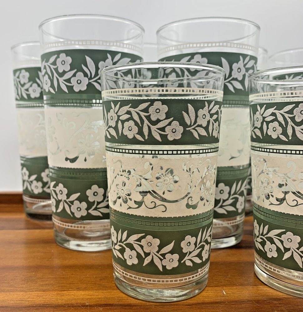 Set of 9 Vintage Libbey Floral Green White Water and Juice Glasses Retro MCM Mid Century Modern Flowers Bands All 9 glasses are in great condition, no chips or cracks! Some of them show some light wear, specifically on the white/cream color band, probably from stacking the glasses. 6 of the glasses are larger 16 oz size and 3 are smaller juice 8 oz glasses. The larger glasses stand roughly 6.25 inches tall and the juice glasses are roughly 4.50 inches tall. Please zoom in on photos for a better view of the item's condition. We do our absolute best to research all items we sell. If you ever have questions, please reach out to me! *We will always package items securely and with care* Thank you for viewing and please visit our store for more awesome vintage goodies!