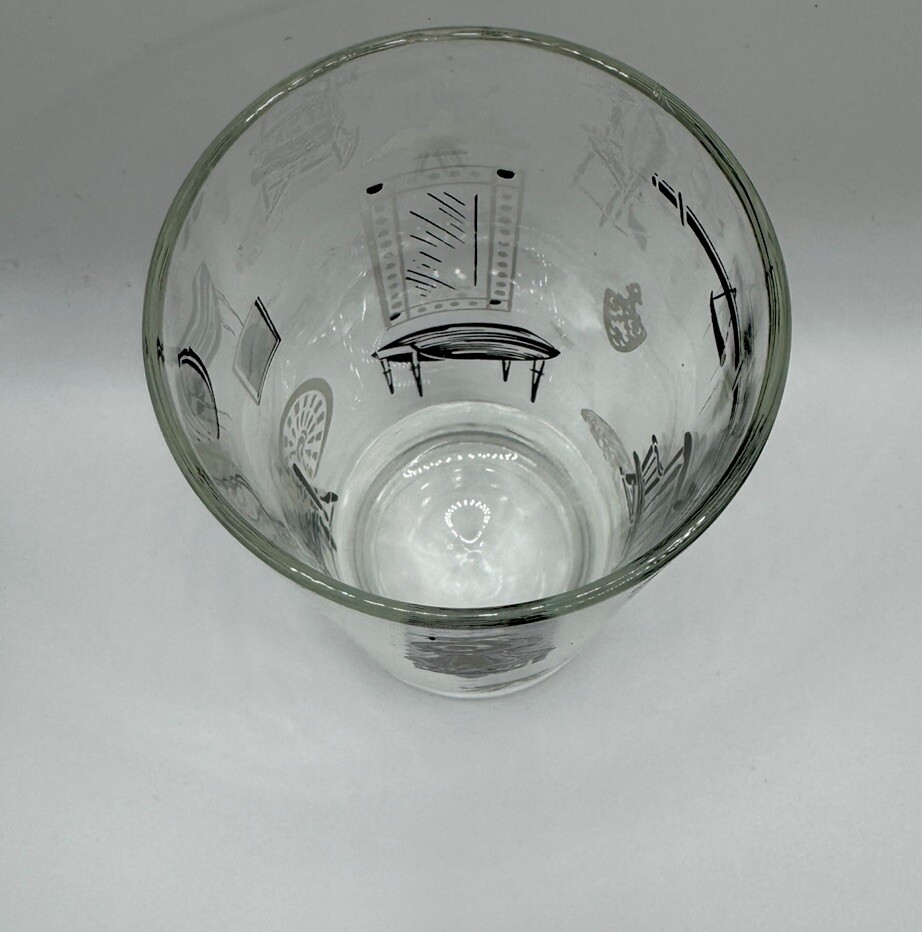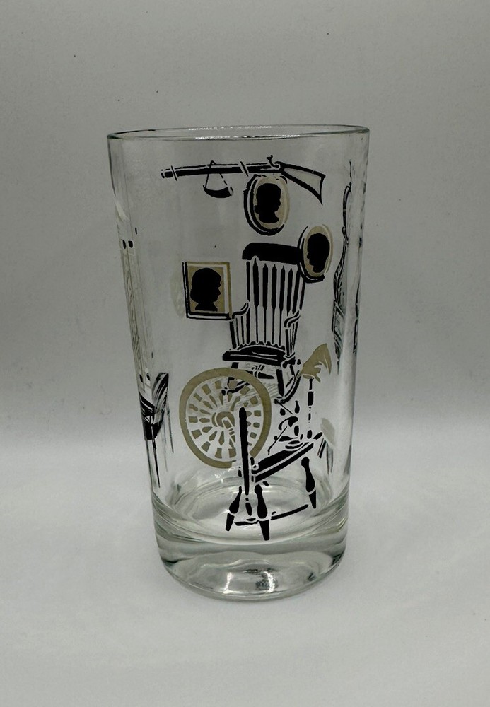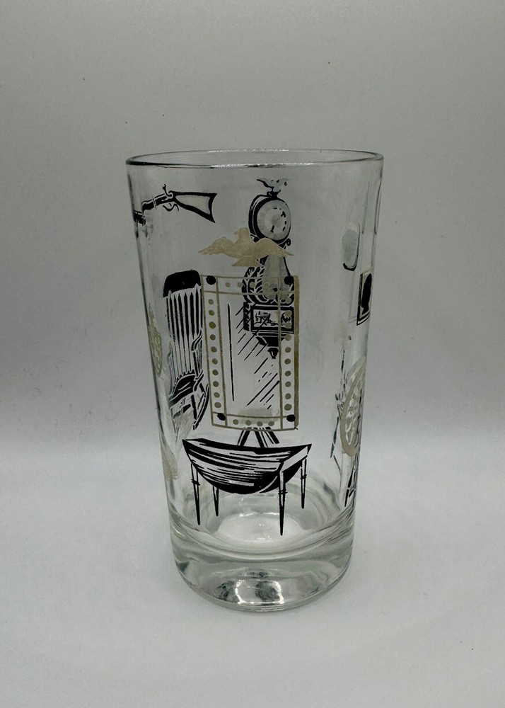 The Libbey Freda Diamond Curio Collection Collins Glass from the 1950s is a vintage barware item with a Mid-Century Modern style. This cylinder-shaped drinkware features a clear glass design with gold, black, and white accents, making it perfect for all occasions. Hand wash only to preserve its originality, this unisex adults' item is a unique addition to any collection, showcasing the theme of MCM furniture in its design.