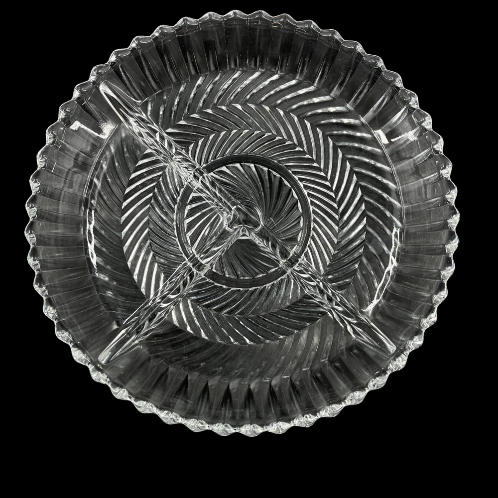 Vintage Libbey Glass Clear Ribbed Swirl Pattern 3 Part Relish Serving Dish 7 1/2" diameter and 1" deep. Three sections.