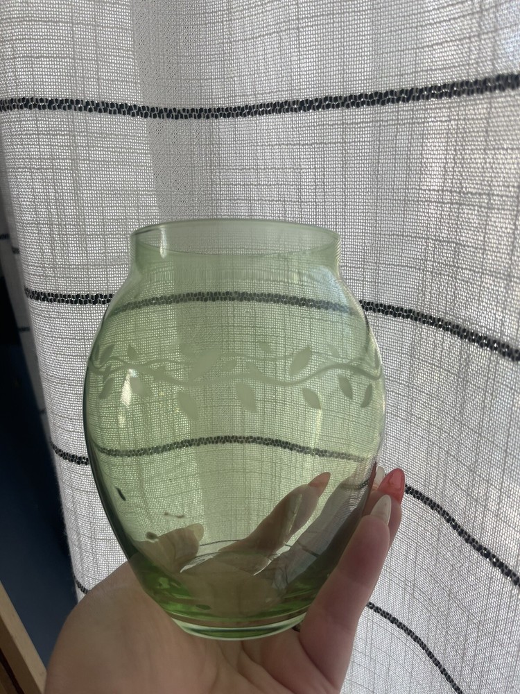 Add a touch of vintage charm to your home decor with this beautiful Libbey glass flower vase. The vase features intricate etched leaves design in a vibrant green color that will complement any floral arrangement. Perfect for any room in your house, this vase is made of high-quality glass that will last for years to come. Its mid-century modern design will add a touch of elegance to your living space. Whether you're looking to display fresh flowers or simply as a decorative piece, this vase is a must-have for any home decorator.