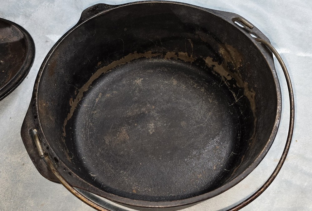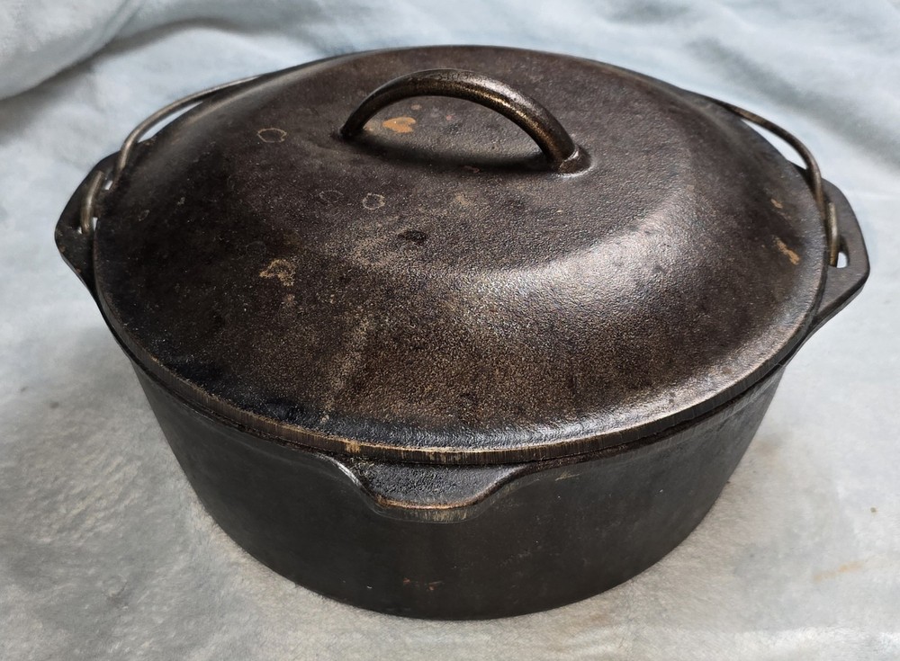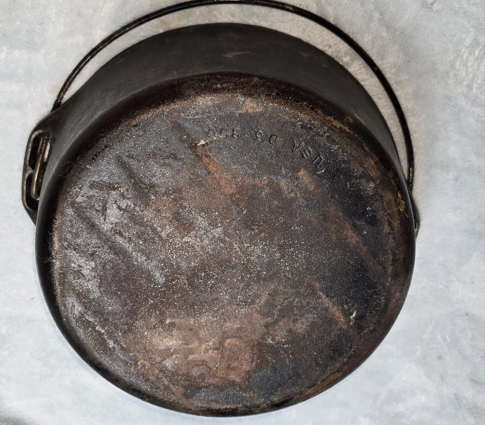 This vintage Dutch oven is a collectible piece of cookware made in the USA. The cast iron material ensures even heat distribution, making it suitable for gas stoves. The 10.25" diameter and inclusion of a lid add to its functionality for cooking a variety of dishes. With its classic design and quality construction, this Dutch oven is a stylish and practical addition to any kitchen.