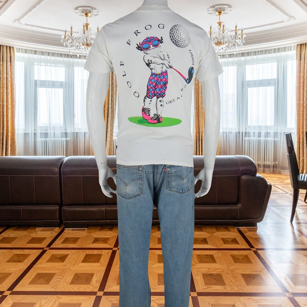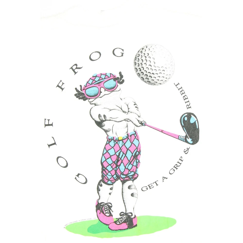 Vintage Lifeforms International Golf Frog Get A Grip & Ribbit Golfing Single Stitch Tee T Shirt S material: 100% cotton made in Jamaica color: white single stitch at sleeves and bottom hem condition: very light yellow stains throughout size on tag: M fits like: S mannequin is 6' 2" and a size medium length (from the front on either side of the collar down to the bottom edge): 26 armpit to armpit: 18.5 all measurements are in inches and taken with the garment laying flat any major defect will be mentioned and/or photographed 14170